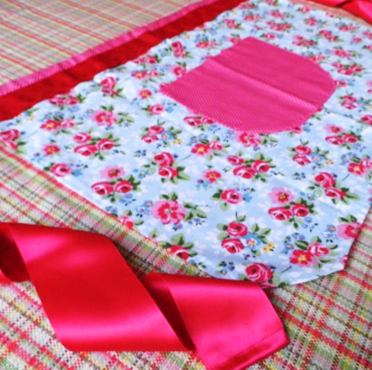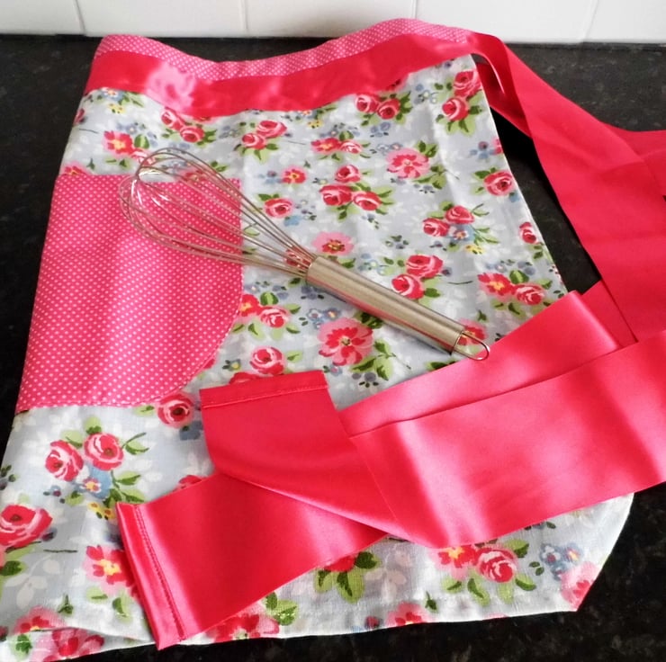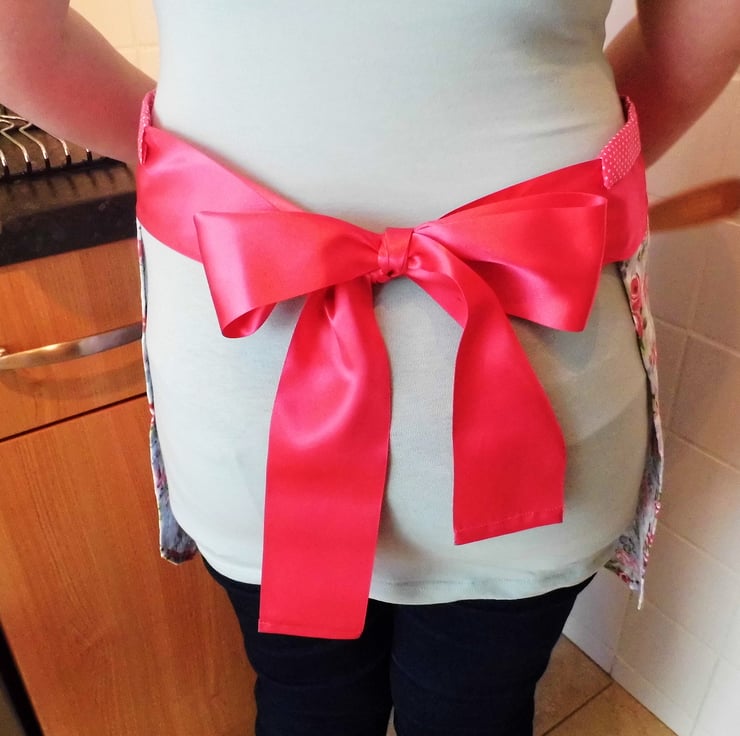 The apron ties are made from a wide pink satin ribbon.
