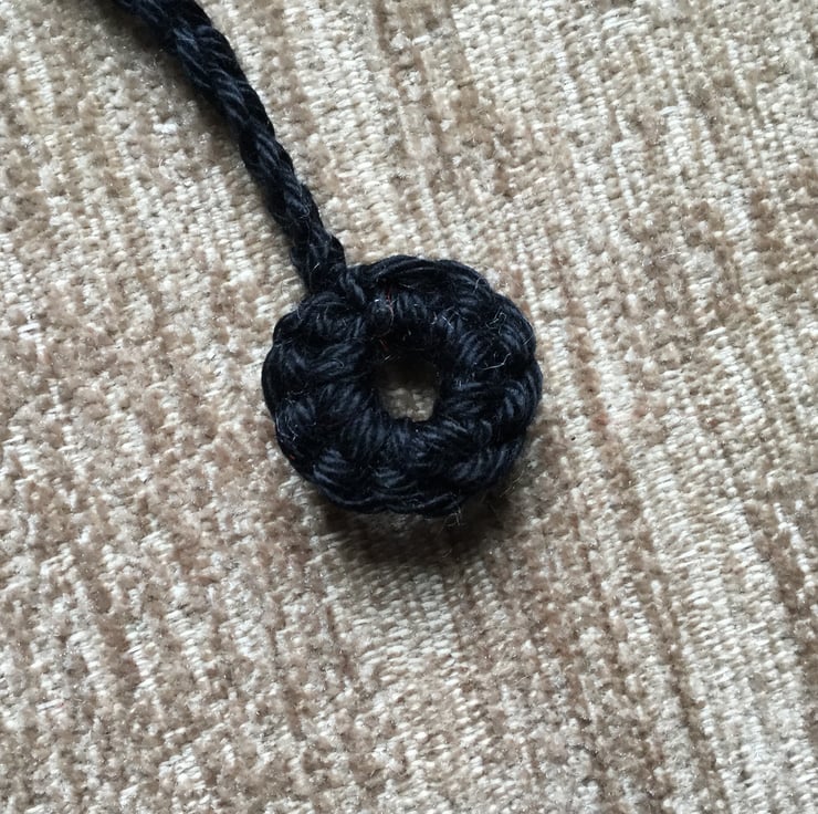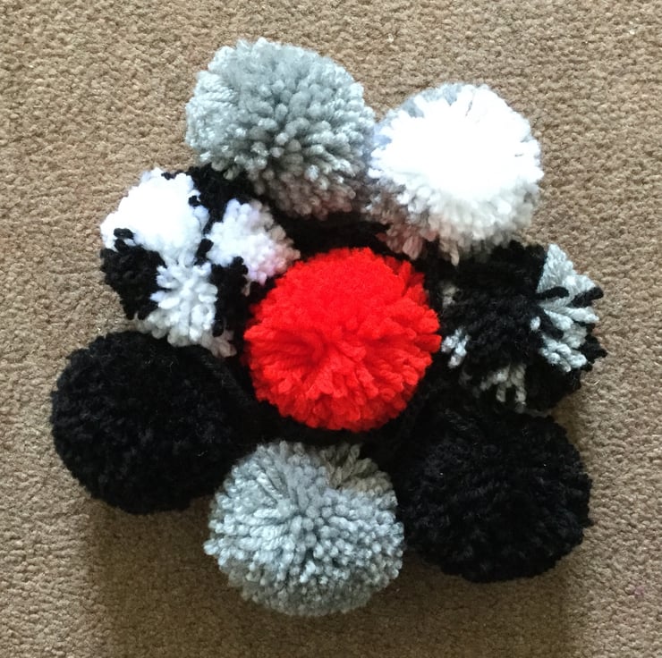 This pompom garland has 7 pompoms in black, grey, white and mixes plus 1 pompom in a bright red all in an acrylic yarn hanging from a crocheted chain in black cotton yarn with loops for hanging at each end.