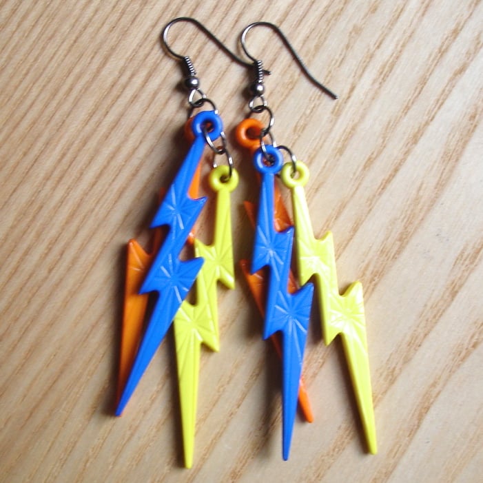 These stunning earrings feature vivid and fun plastic lightning bolt charms. They are hung off black plated jump rings and black plated earwires. Really bold, lightweight and fun to wear.