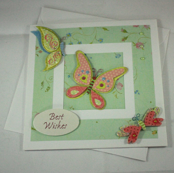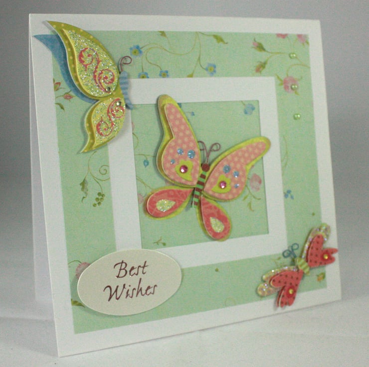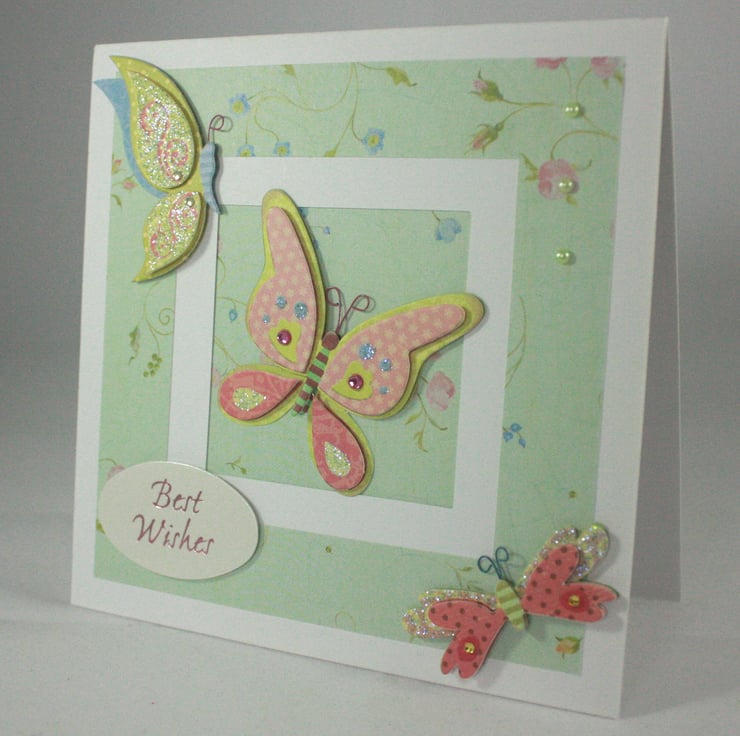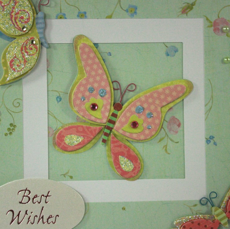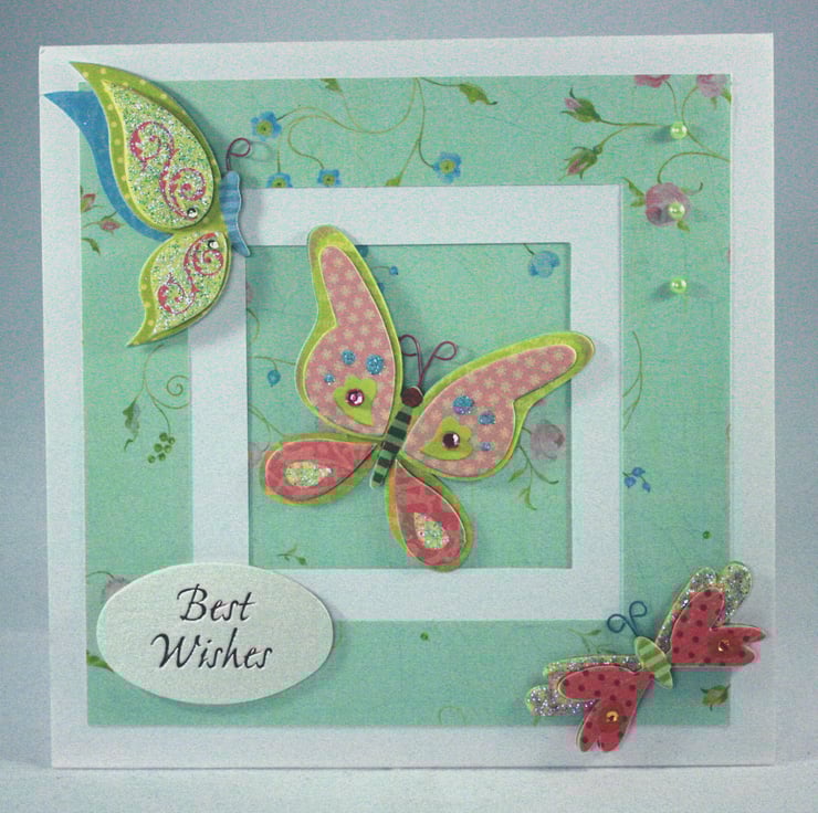 Square, any occasion card featuring 3 dimensional, glittered butterflies on an aperture card. The inside of the aperture and the frame around it have been cut from the same floral patterned paper. A foiled 'Best Wishes' greeting and 3 pale green gems finish the card.