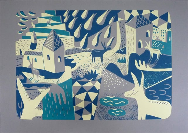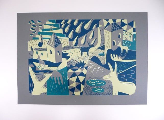 This is the third print in the donkey-world series, a continuation of my donkey theme, but perhaps a little more loose and abstract. I decided to try and create a secret world that only donkeys know about, and it turned out like this! The print is also a rarity for me, being in landscape orientation (rather than portrait).