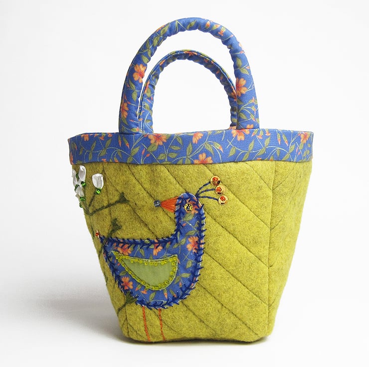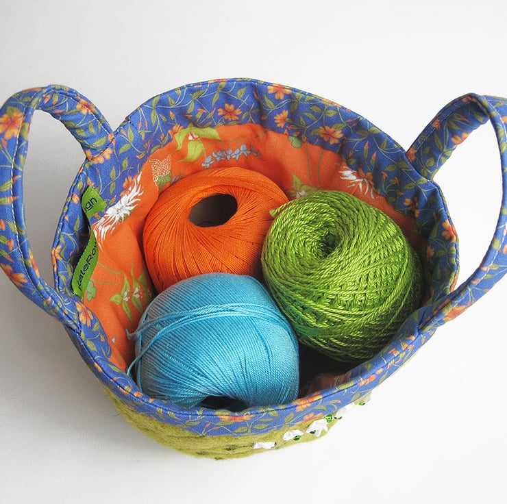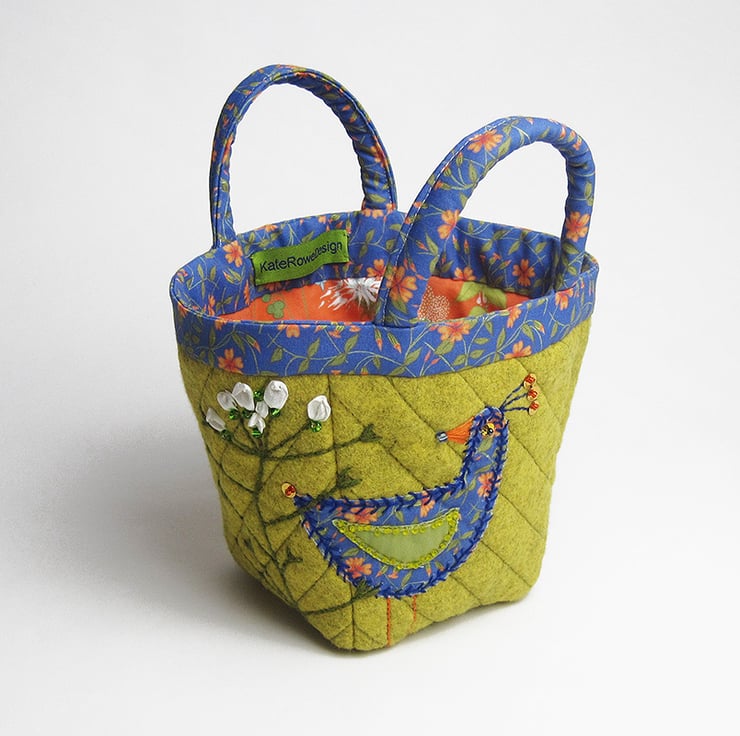 The project/knitting bag has been made using mustard coloured wool felt. I have appliquéd a bird onto the bag along with a wool embroidered shepherd's purse flower. The outer has been quilted to add structure. The lining and handles are made using my own complimentary prints. The bag is suitable for craft projects - it is bucket shaped so you can find things easily. The depth of the bag is 15cms(6 inches)and the base is 9cms square(3.5 inches square).