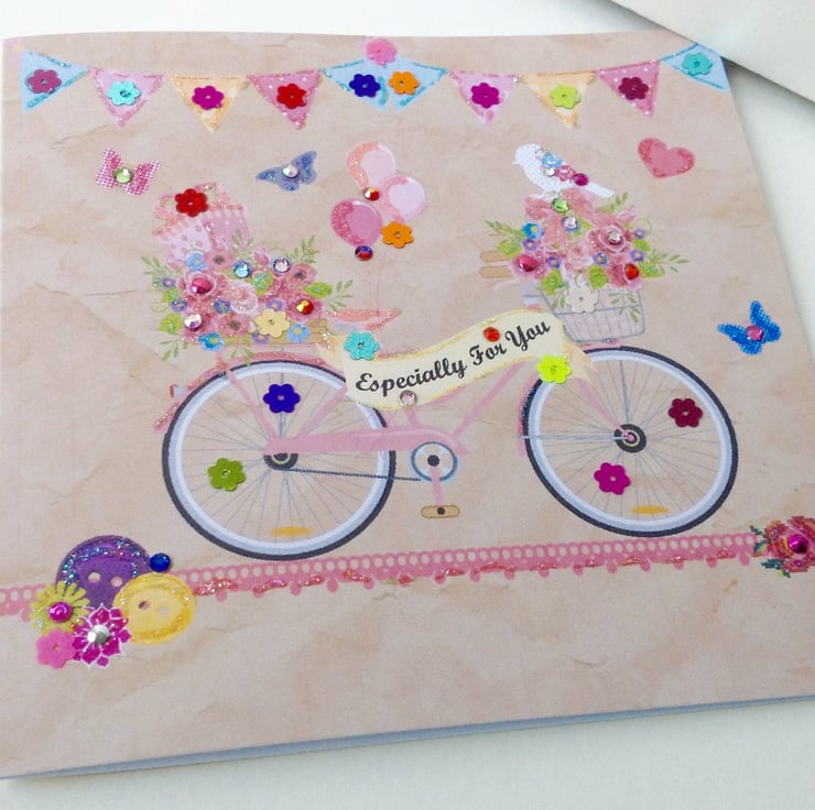 The design is on a Kraft effect background,and a bright and colourful bicycle and floral design with text banner which show the greeting itself, I have then Handfinished the card with Crystals,embellishments,and a touch of glitter paint.