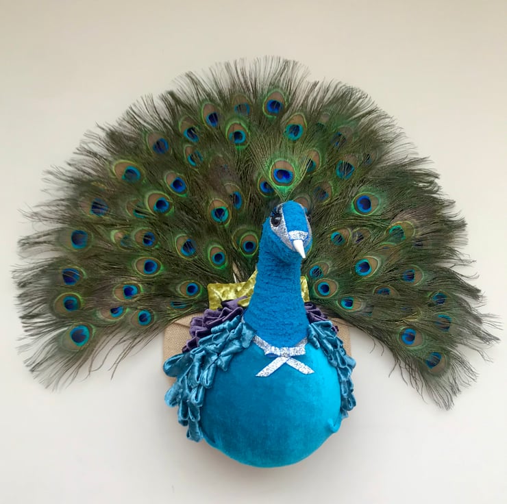 Handmade with 100 crushed velvet feathers wall mounted diva peacock