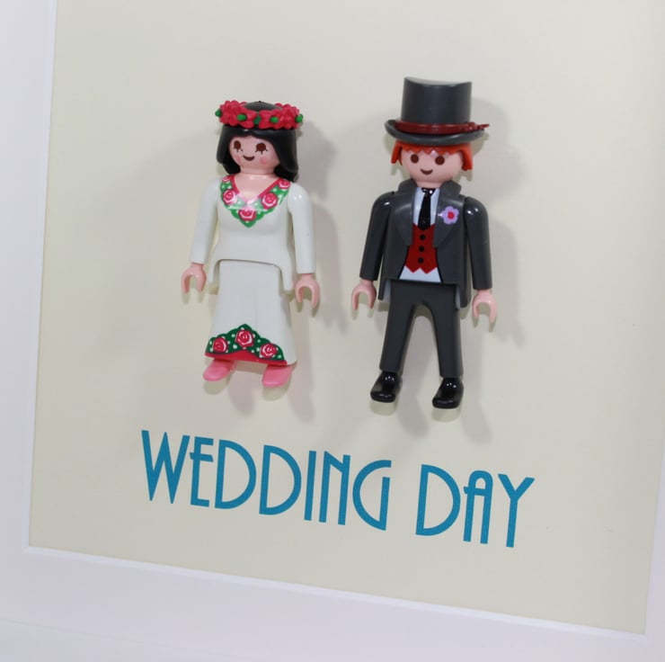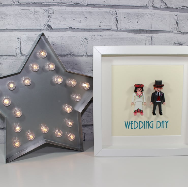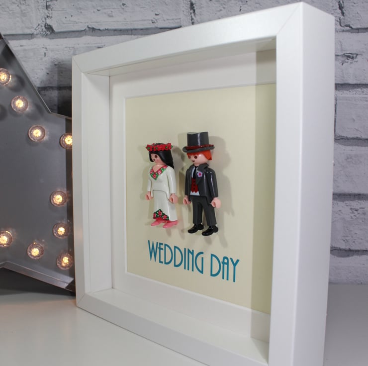 This white deep box frame features a stunning and highly collectable Playmobil Bride and Groom to create a fabulous and unique gift for the happy couple. We have carefully mounted these in to the box frame and printed "Wedding Day" underneath for a very elegant gift.