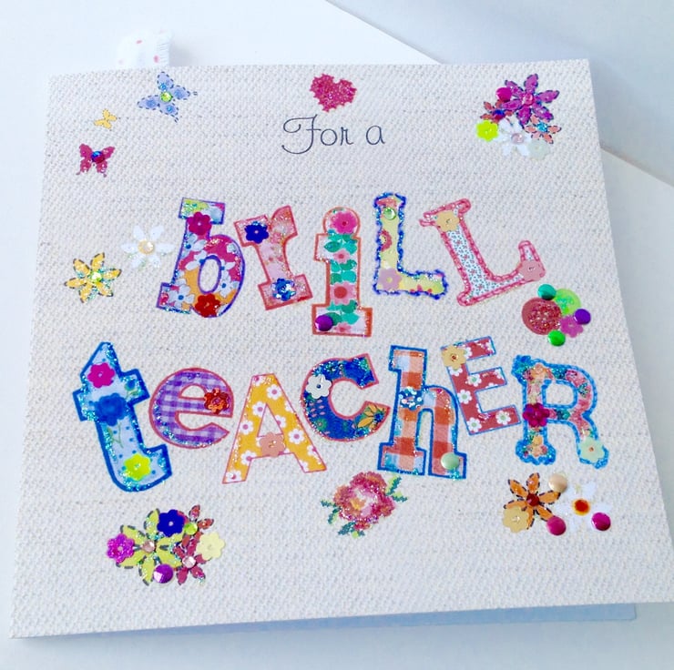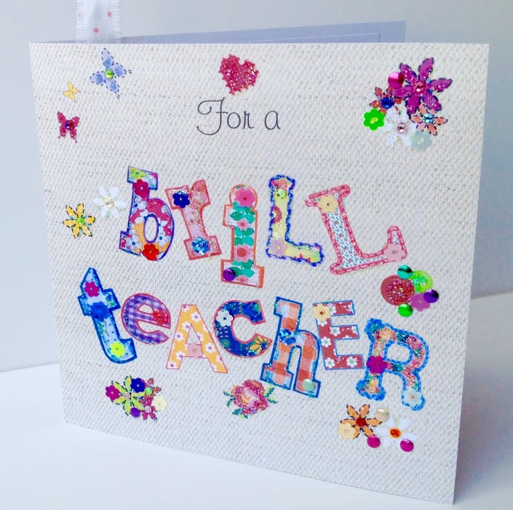 The Applique work is the main design as it spells out 'Brill Teacher', with smaller text for the remainder of the greeting.