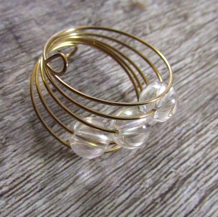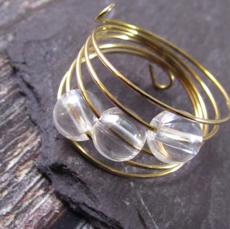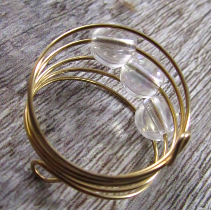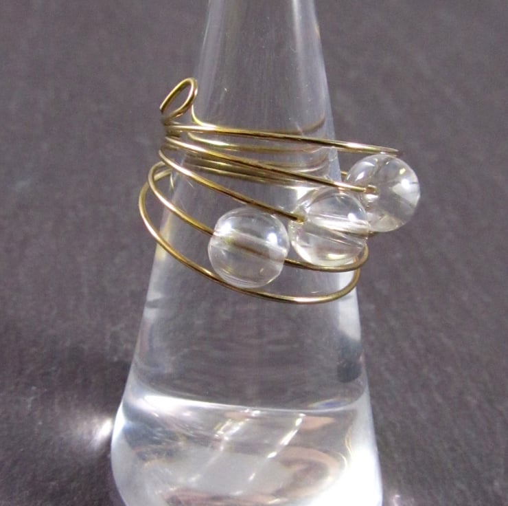 The ring is size N without adjustment. The memory wire can be manipulated to fit any ring size. The quartz beads are 6 mm in diameter.