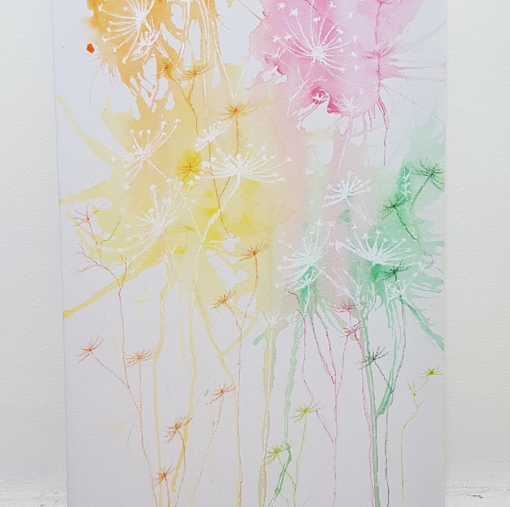 I have used yellow, green, pink and orange water colours on a 15 x 8 inches stretched canvas.