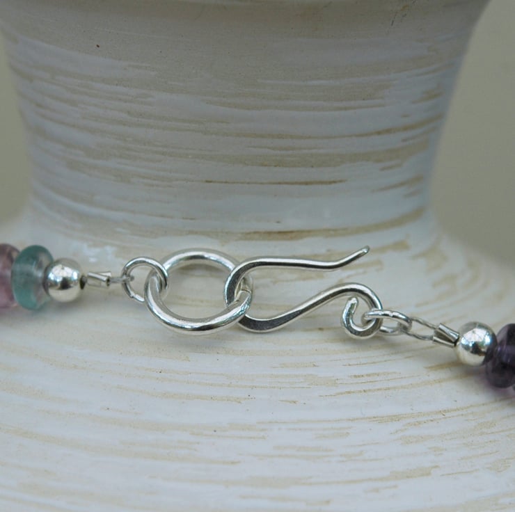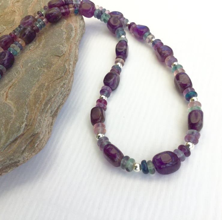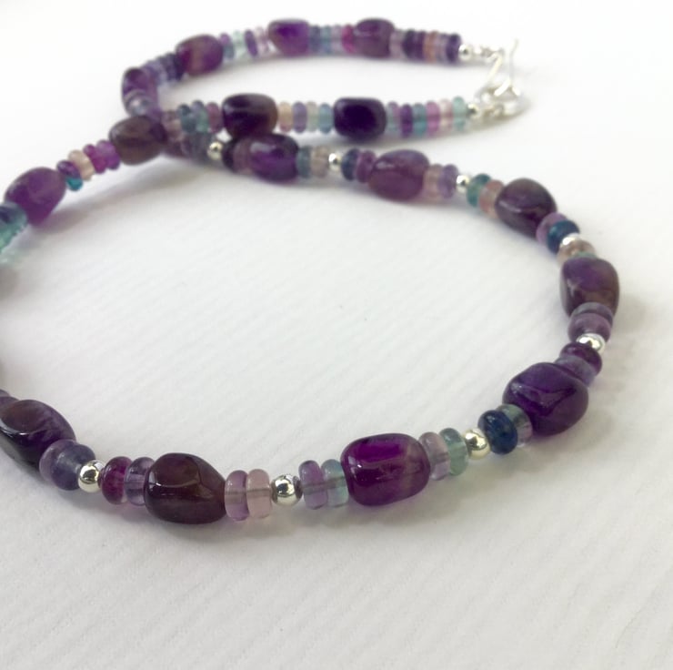 This gorgeous sterling silver and gemstone necklace features chunky nuggets of deep purple amethyst, the birthstone for February. They are complemented by smaller rondelles of rainbow fluorite in heathery hues of lavender, purple and blue-green. To enhance the light and sparkle in the stones I have added round beads of sterling silver around the front of the necklace. The sterling silver hook and ring clasp has been hand made by me. If you wish I can add an extension chain for an extra £5. The necklace is available on its own or as part of a set including matching earrings. These are listed separately in my Folksy shop but I will apply a 10% discount if you buy the two together.