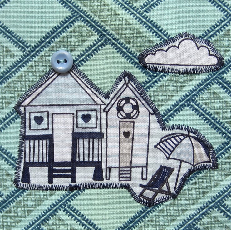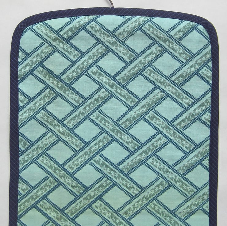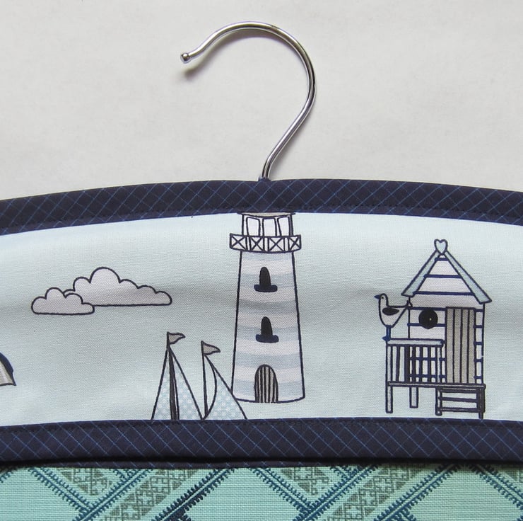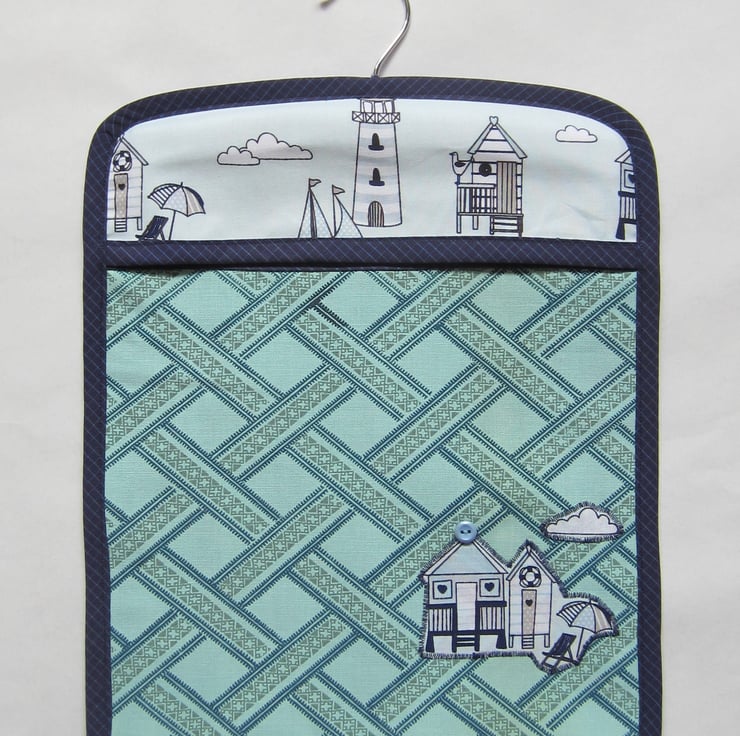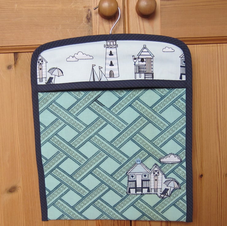 Sturdy blue and green peg bag decorated with an appliqued beach hut and button. Fully lined with a light blue-grey and cream striped fabric and edged in a navy and light blue check bias binding. Plenty of room for lots of pegs or use for other storage. It measures 35.5 x 30 cm and hangs with a strong wooden coat hanger.