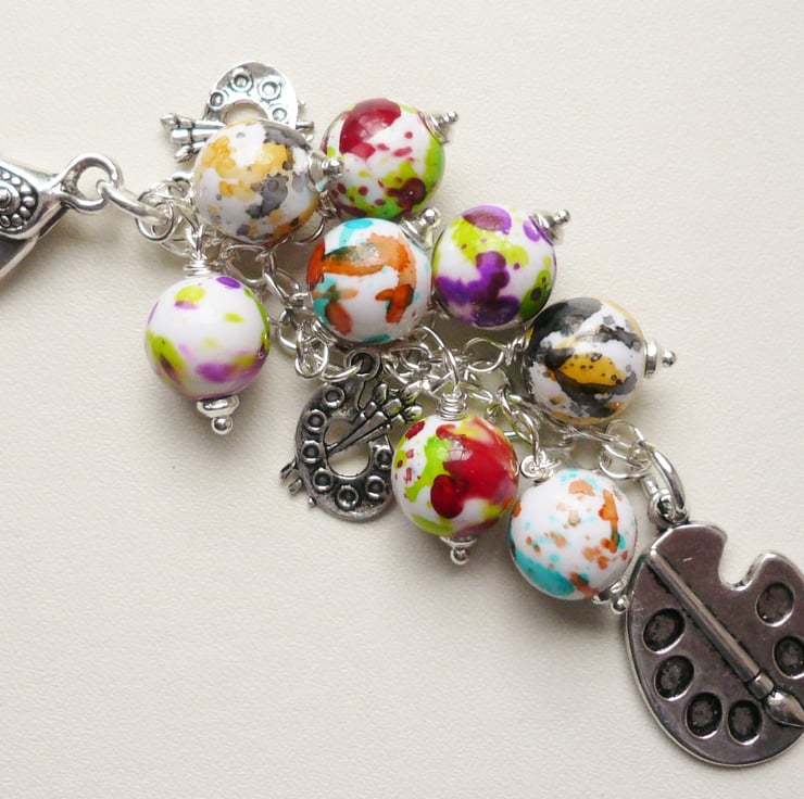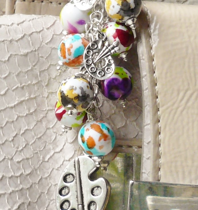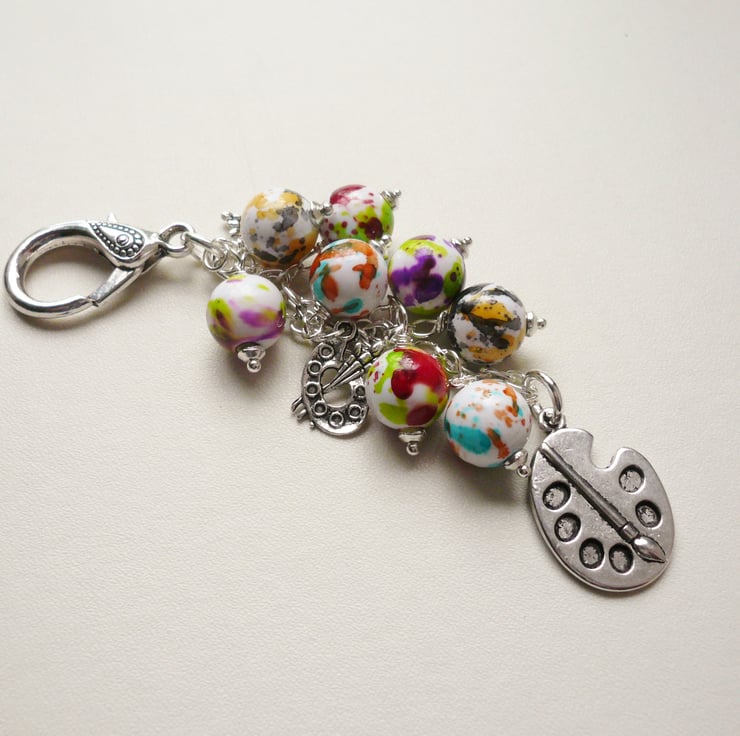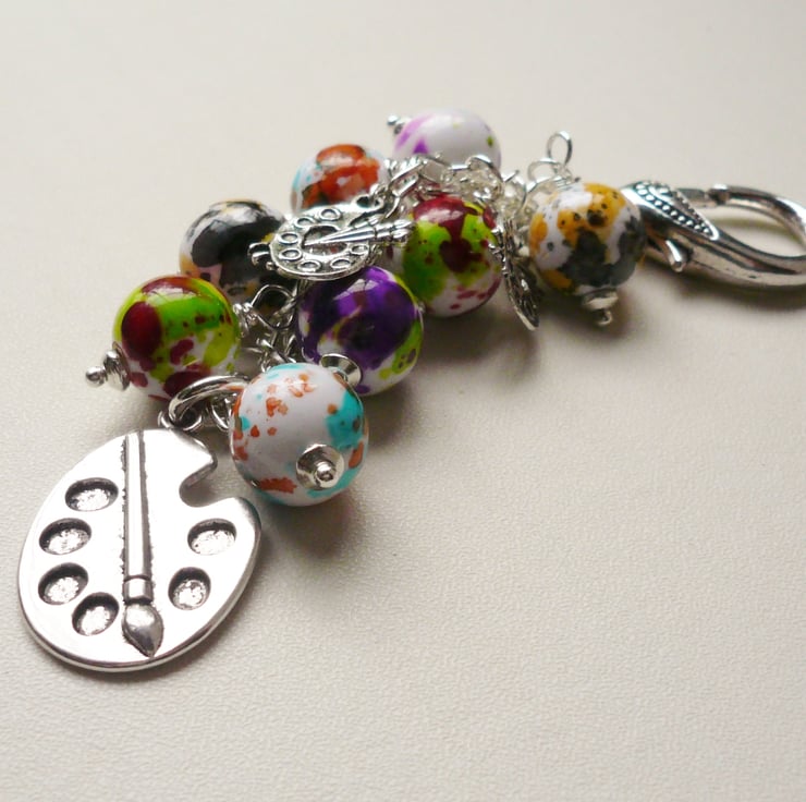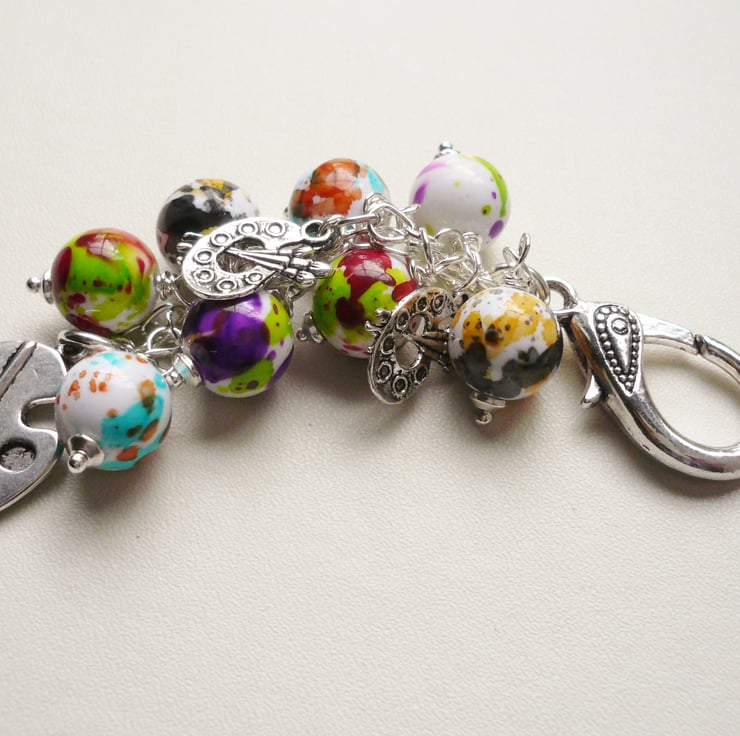 This Artist or Painter's themed bag charm consists of a collection of 12mm round acrylic paint splashed effect beads in various different colours. These have been teamed with artist's paint palette themed Tibetan silver charms with a larger 25mm long one hanging below. All attached to a silver plated chain and 28mm long trigger clasp.