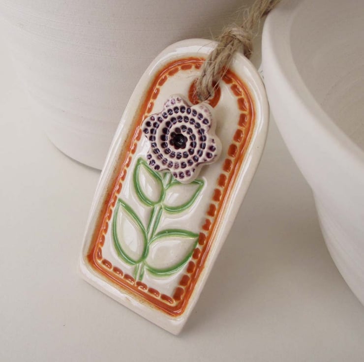 This cute little flower tag decoration is made from white earthenware clay and imprinted with a leafy design. A handmade ceramic flower has been added to the front.