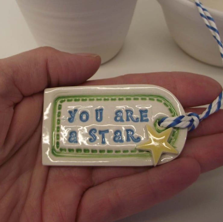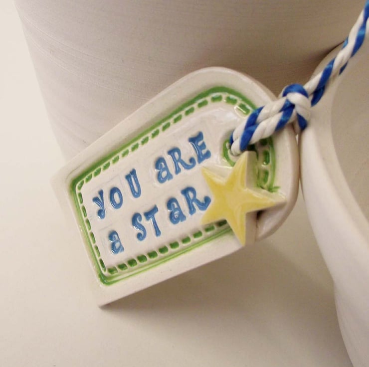 This cute little tag decoration is made from white earthenware clay and imprinted with the words "You are a Star. A handmade ceramic star has been added to the front.
