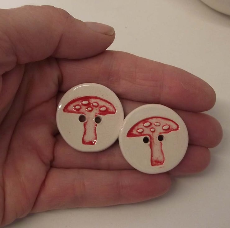 This set of two toadstool print buttons are made from white earthenware clay, embossed and glazed to 1100 degrees, so nice and strong.