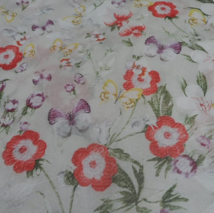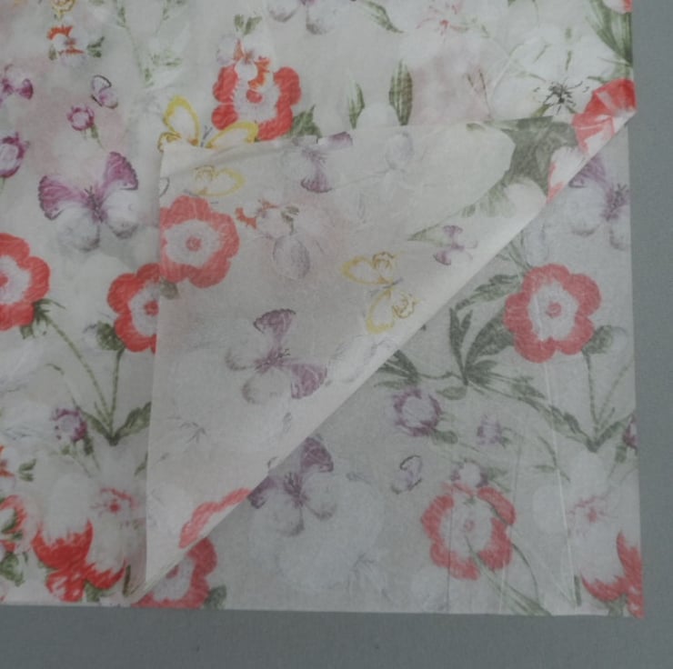 20 sheets of pretty pink floral tissue paper. Each sheet measures approximately 51cm x 78cm (20" x 31") and has a flower and butterfly print on it. Ideal for wrapping beautiful items prior to shipping to add that little something extra. Shown folded in 4 in photo.