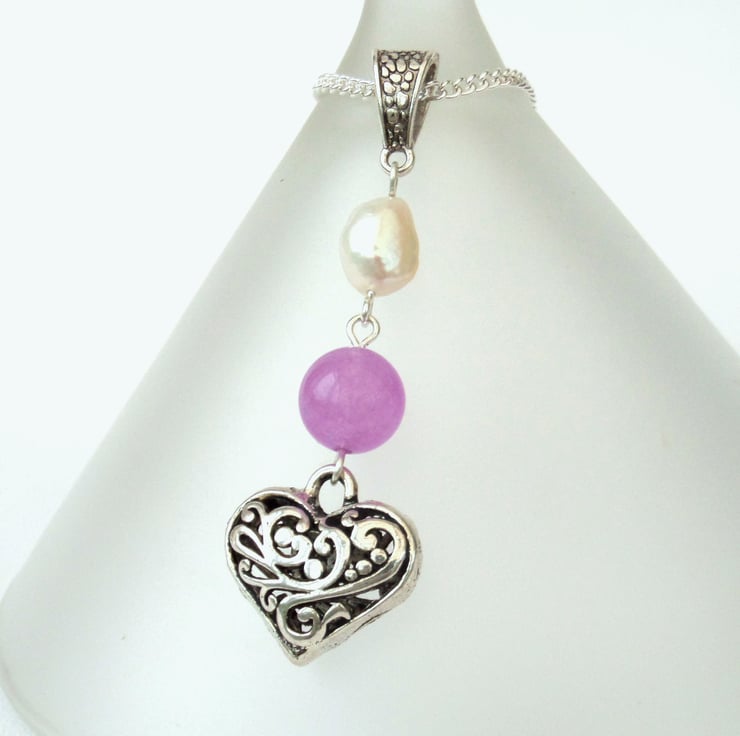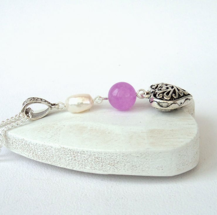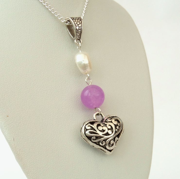 A dainty charm necklace, with a single white pearl, lavender jade and tibetan silver heart charm.