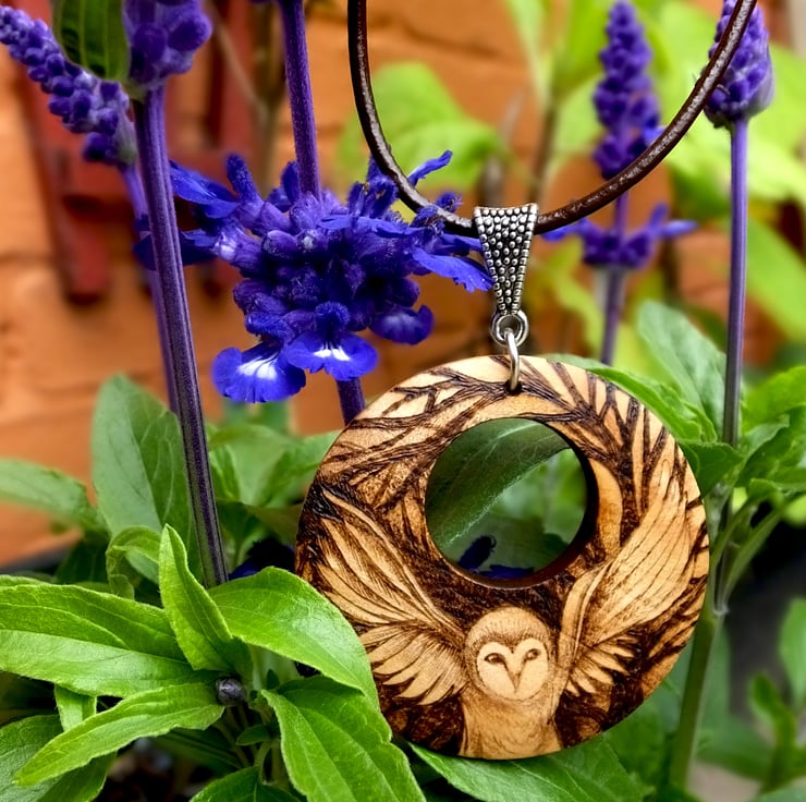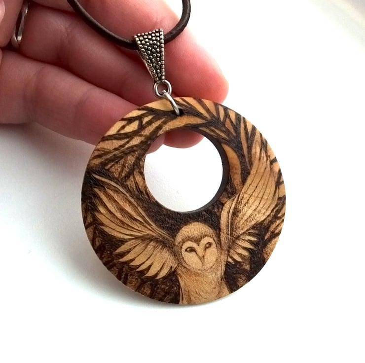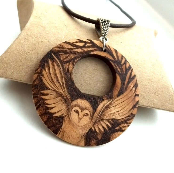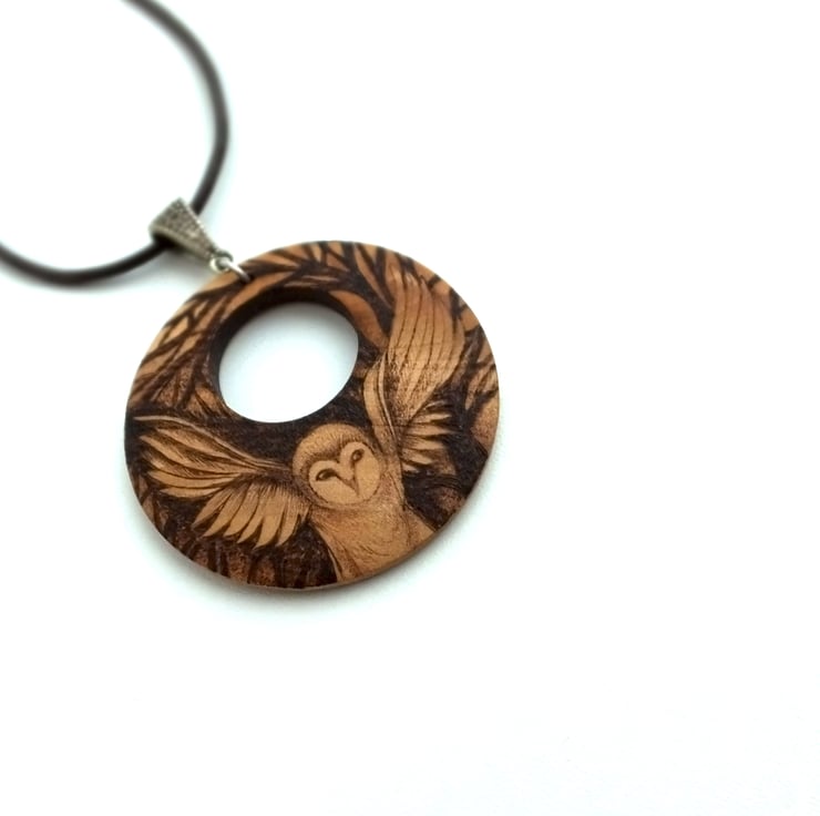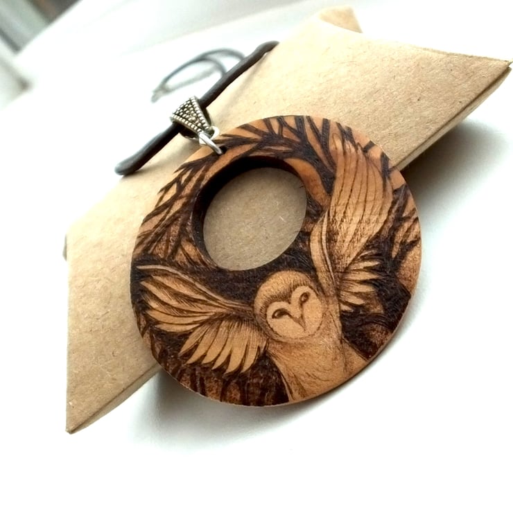 The image is my own, drawn freehand onto the wood. I use no templates or transfers, and each pendant is a little different. These pendants are quite challenging as the area to create a design is so small. The design on this pendant is beautiful owl, on a dark night in the woods, wings out stretched in flight following the lines of the pendant. I try to photograph the items in different lights.
