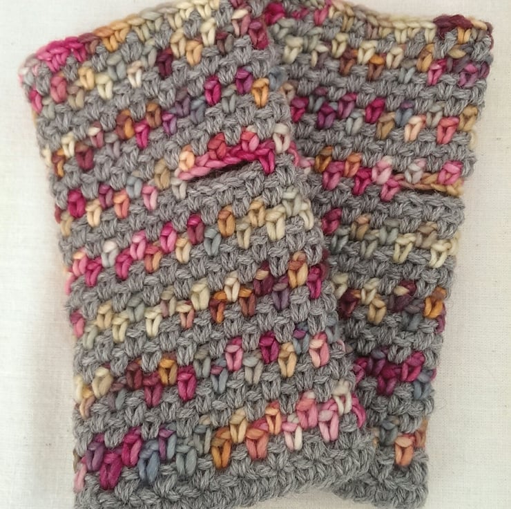 A pair of fingerless gloves made in two types of yarn - a mix of alpaca and wool combined with merino and silk. Two shades that compliment each other.