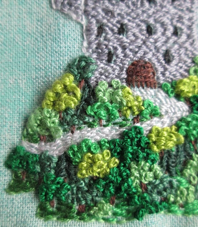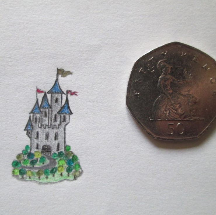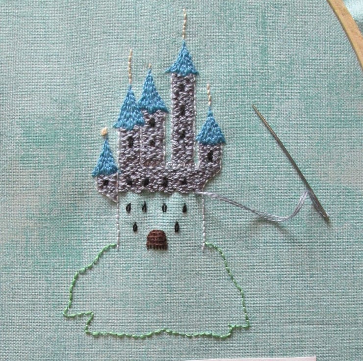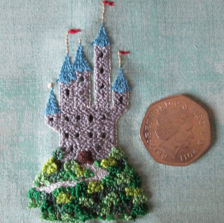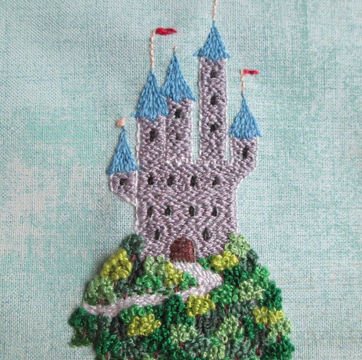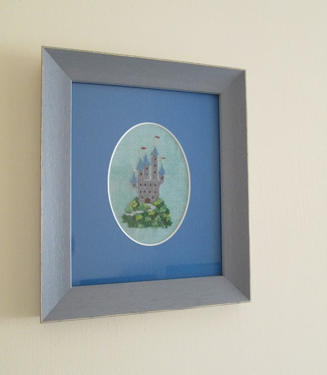 A tiny, hand embroidered castle in a frame - I love fairy tales and drew my first tiny castle over thirty years ago, using very, very sharp pencils. To create this embroidery I've scaled the picture up and worked the design in single strands of embroidery thread on a cotton background. Set in a rich blue oval mount (aperture 11 cm high by 7.5 cm wide) and framed in grey to echo the stonework, this would work well in a child's room or be a lovely gift for anyone who believes in 'Once upon a time...' It would even make an unusual housewarming gift.