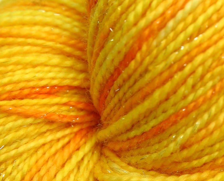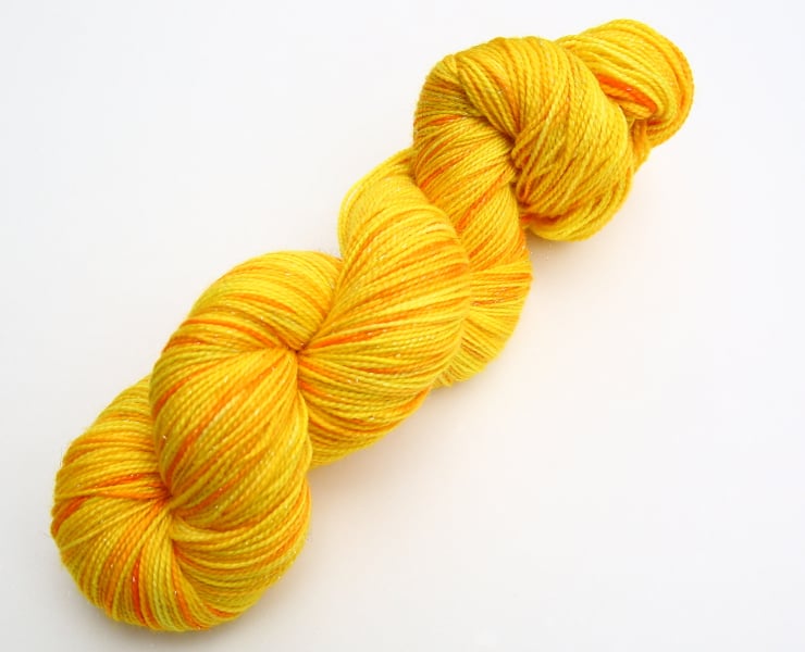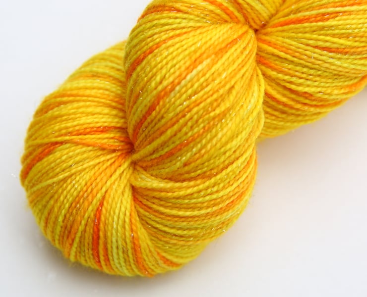 Bright sunny yellow with hints of orange and some silvery sparkle. This is a soft, lustrous 4-ply weight yarn with added stellina sparkles, that are almost impossible to capture accurately in photographs (they show as whitish flecks). In real life they catch the light and add a little sparkle - which I have tried to illustrate in the third photograph. Photographs have been taken and edited in bright natural light.