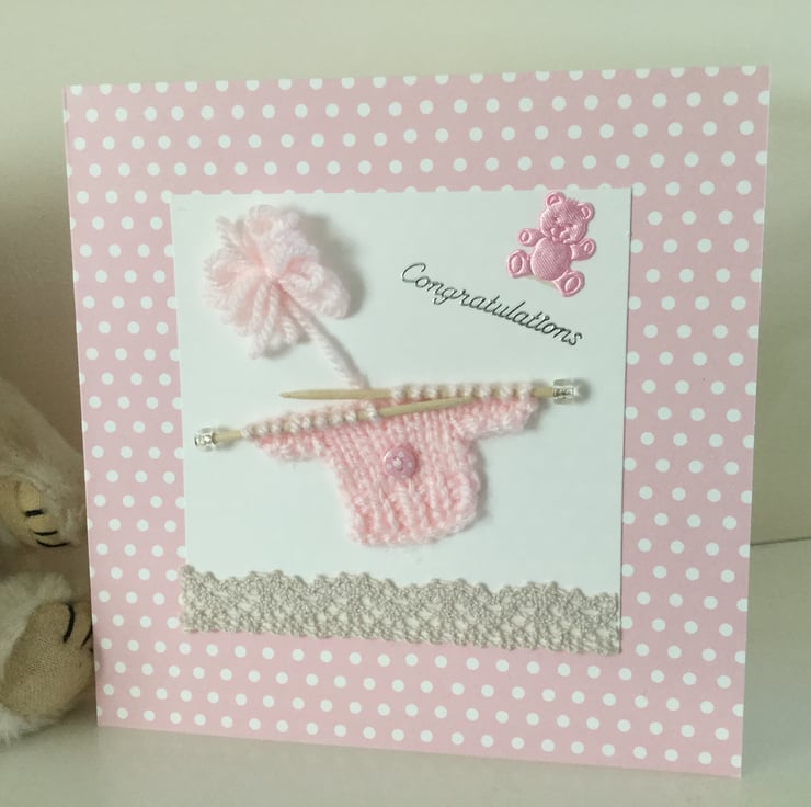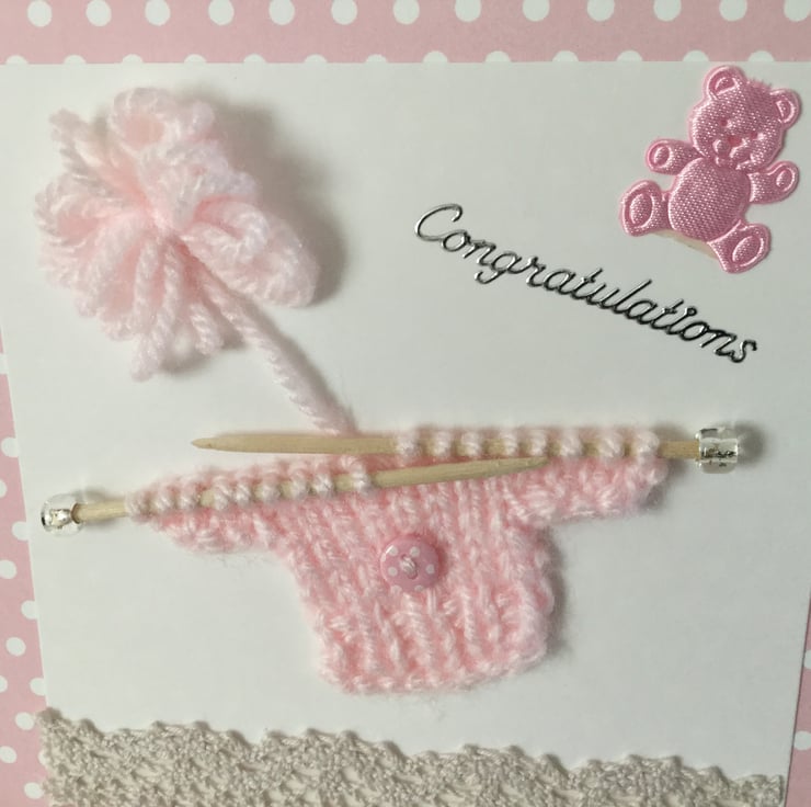 It features a cute little jumper on handmade miniature needles which I have knitted in a pink acrylic yarn it is decorated with a tiny pink and white polka dot button.