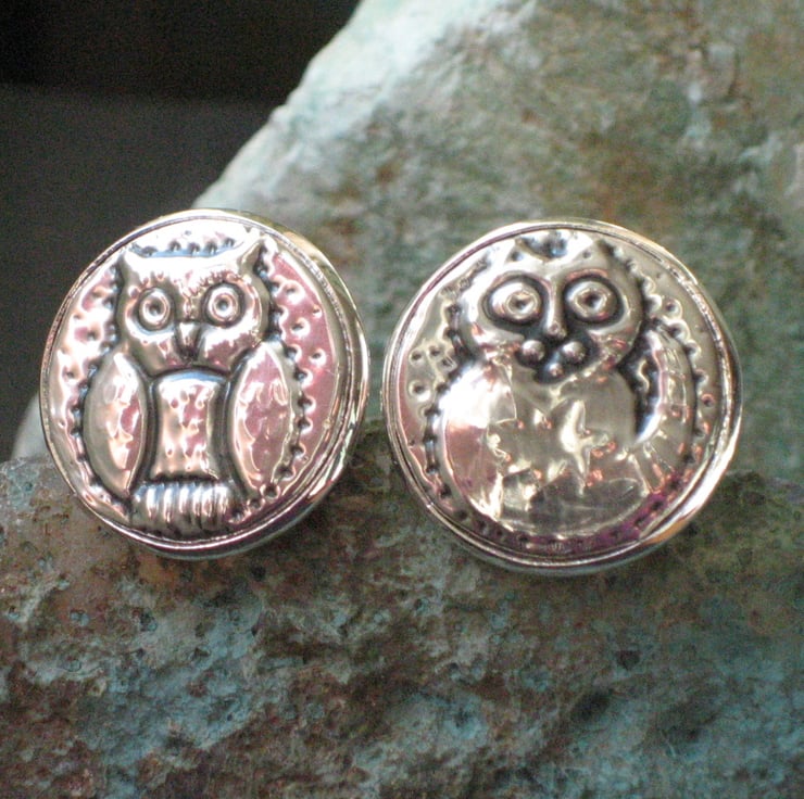 The Owl and the Pussycat silver pewter cufflinks, hand crafted. Each cuff link measures 21mm across and has been crafted by hand in shiny lead-free pewter. Edward Lear's famous duo will be delivered in a smart grey gift box. These cufflinks are a favourite for Weddings and Engagements and make a wonderful 10th Anniversary Gift.