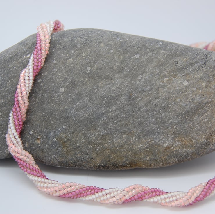 This lovely spiral necklace in shades of pink and white has quite a summery feel. Because I made it with different types of beads it has an interesting texture rather than being smooth. It is 19ins (48cms) long with a silver ball and socket clasp.