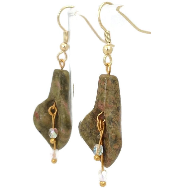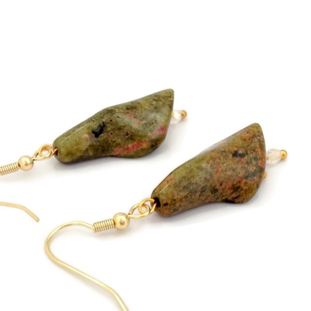 Unakite is a mottled form of Jasper and features lovely swirly patterns of greens, peaches and terra cotta that are unique in each stone, so no two will ever be the same.
