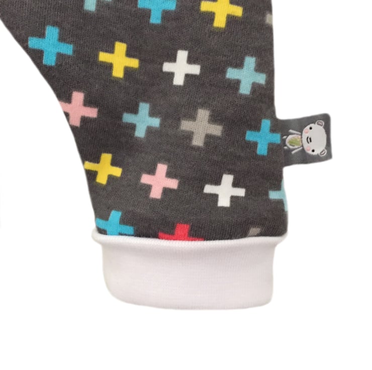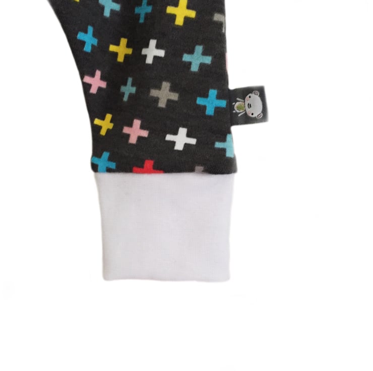 Super Cute and easy to wear Modern Harem Pants - let your little one wriggle away in these super soft 100% Premium cotton fabric Baby Harem Pants in Charcoal Grey & multi-coloured MINI CROSSES print to give that perfect Modern Edge to your babies outfit.