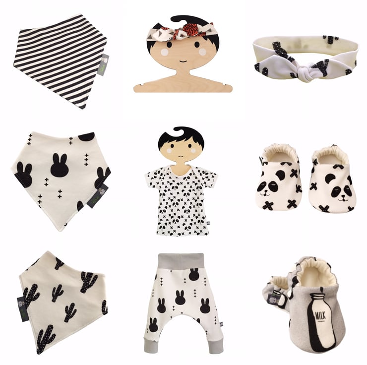 Complete an outfit with our Super cute easy to wear Bandana Dribble Bibs, Knotted Hats, Knotted Headbands, Scratch Mittens, Tees, Onesies, Leggings, Relaxed Cuff Pants, Harem Pants and super cute soft soled Pram Shoes
