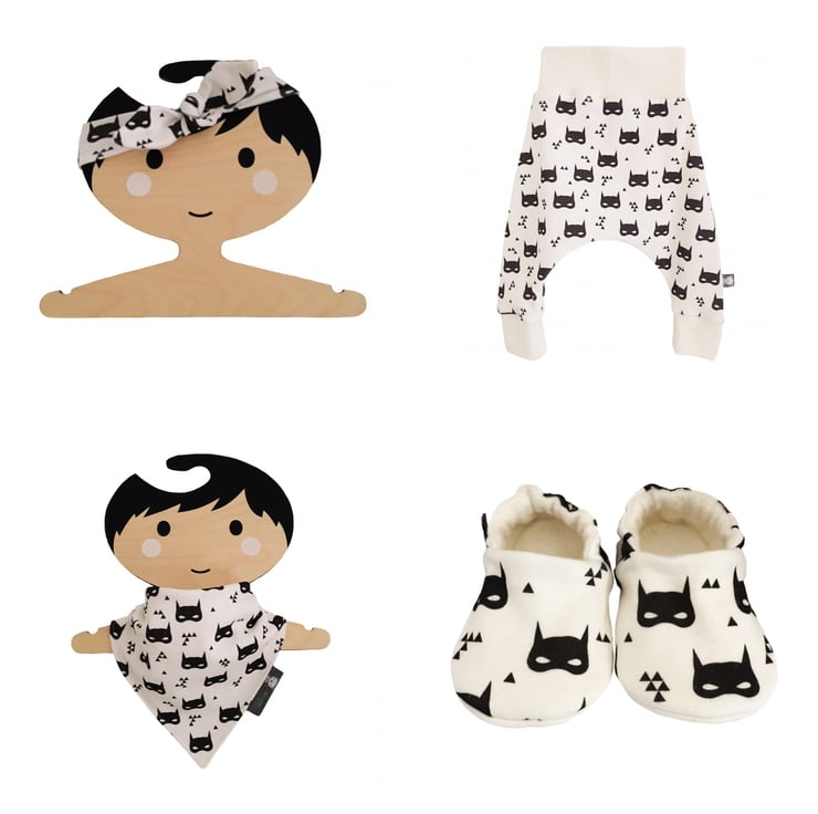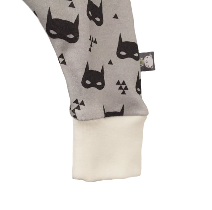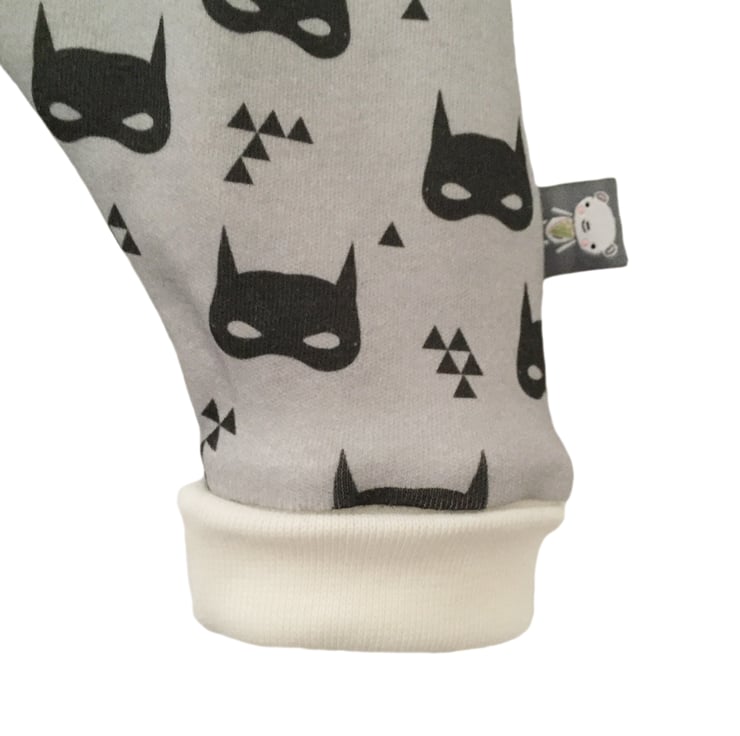 These stylish monochrome Harem Pants in a ultra cute black Superheros masks print on grey are made from beautifully soft GOTs certified organic jersey knit fabric made using low impact dyes and are free from all harsh chemicals, so you can feel good about dressing your little one in them! (See last 2 pics for co-ordinating items).