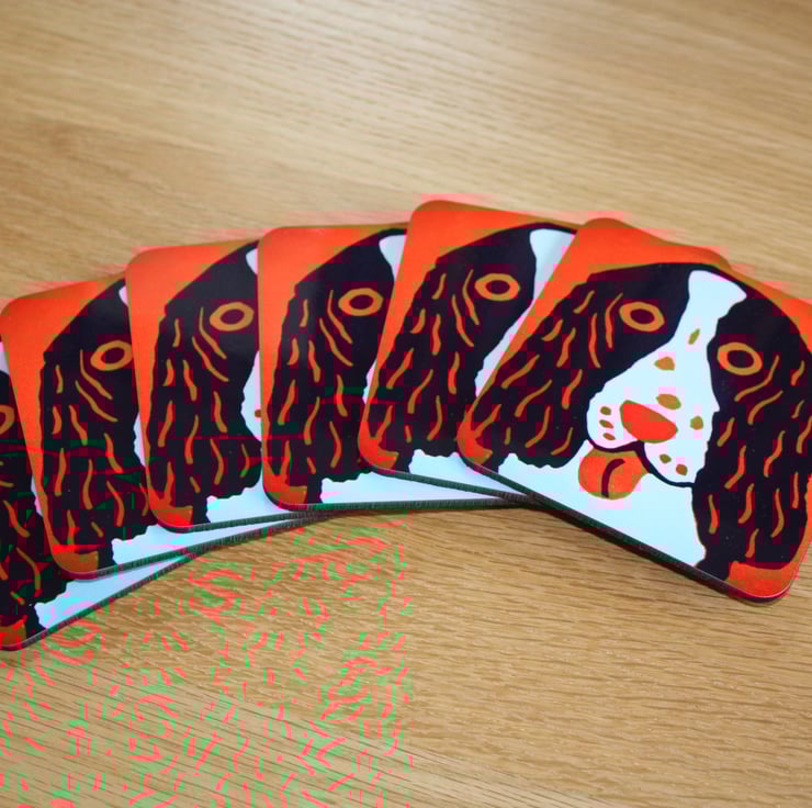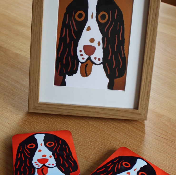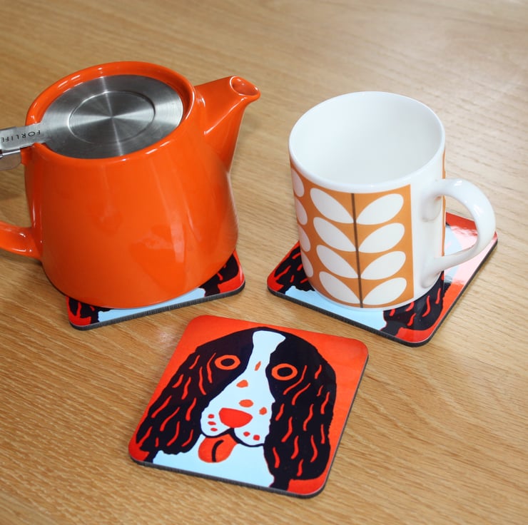 My lovely happy orange spaniel dog linocuts have been photographed and printed on to coasters. The coasters are heat resistant with a non-slip cork backing and each coaster measures 4"x4". Perfect for the dog lover in your life or to treat yourself!