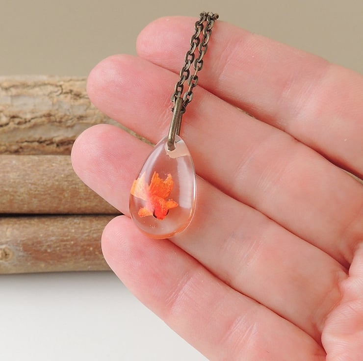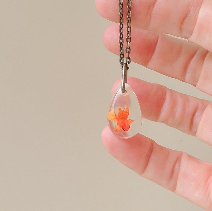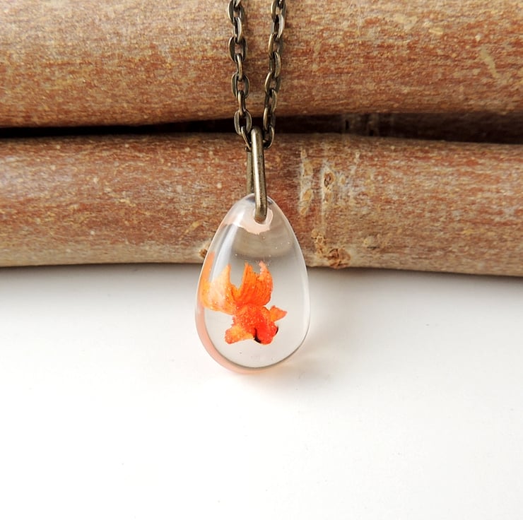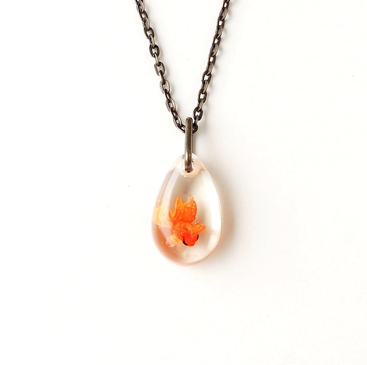This whimsical necklace has a little orange goldfish "swimming" in a small resin teardrop shape pendant.