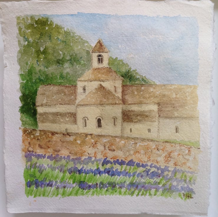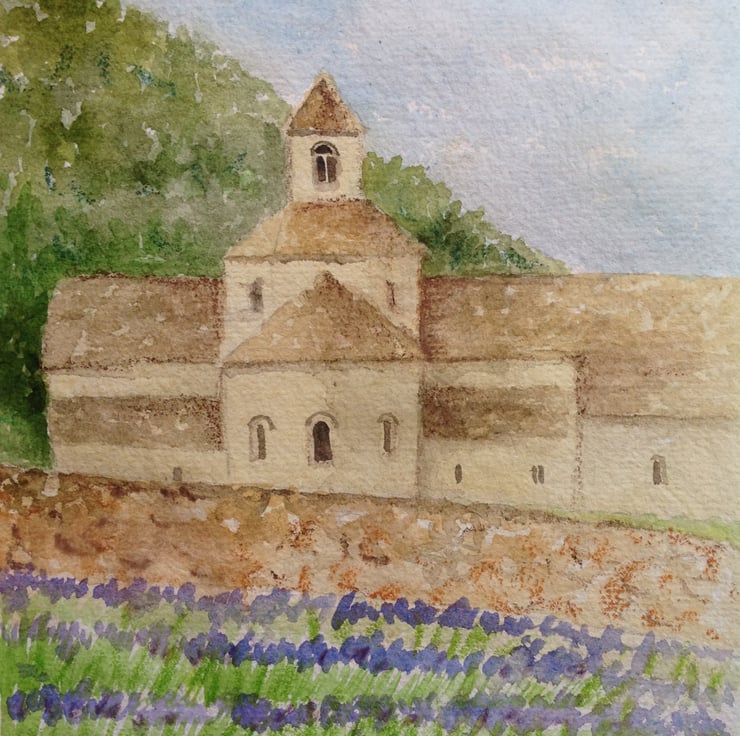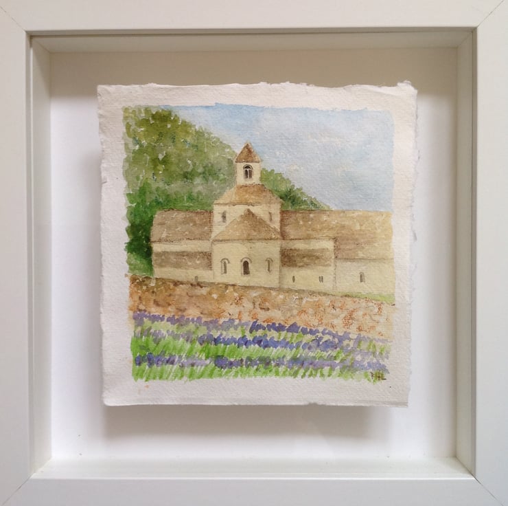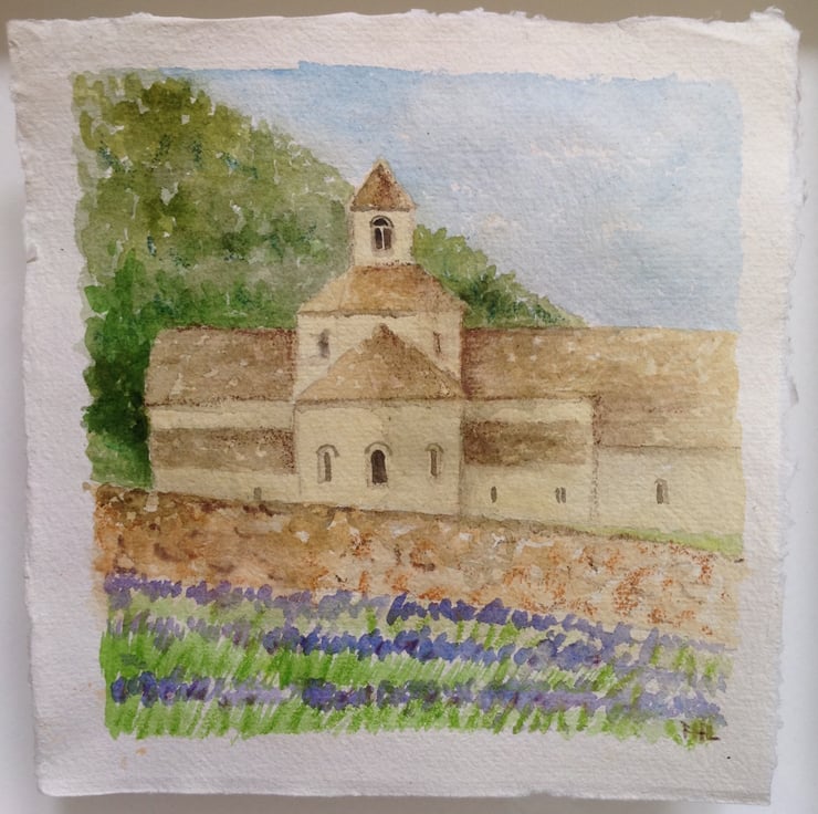 A unique painting of Senanque Abbey in Provence on Khadi handmade paper, created with watercolour paints and water soluble wax crayons.
