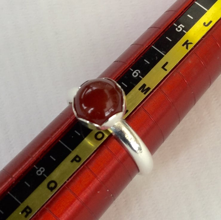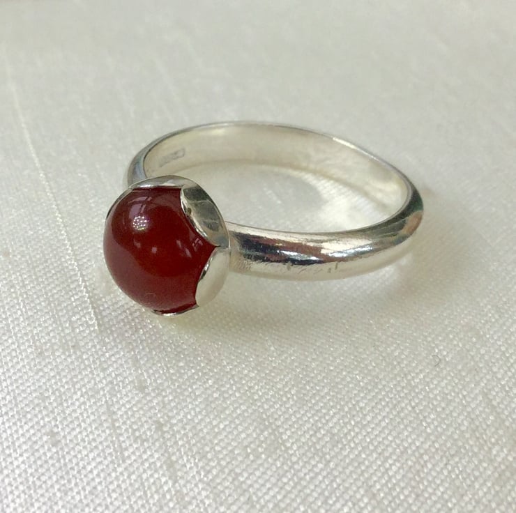 This sterling silver ring features a gorgeous orange red cabochon of semi-precious carnelian. The gemstone is highly domed, semi translucent and a yummy fruit gum colour with a wonderful shine. It is mounted in a pretty flower petal setting. The ring shank is 3.2mm wide with a D-shaped profile. Traditional silver hallmarks including my own maker's mark have been applied by the London Assay Office. It is available in size N1/2. This item will be packaged in a smart gift box and sent by Royal Mail first class delivery service.