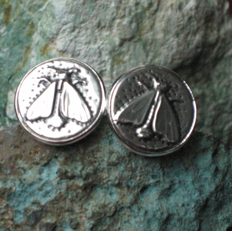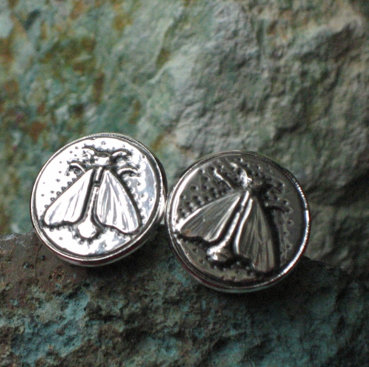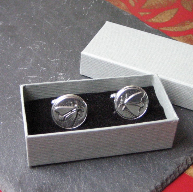 Silver bee cufflinks hand crafted in pewter. These shiny bee cufflinks have been made by handmade using the repousse method of embossing lead-free pewter. Measuring 21mm across, they would be an ideal present for a man who loves wildlife, gardens and bees. Pewter can be a gift for a 10th Wedding Anniversary so these could be an apt gift for an apiarist!