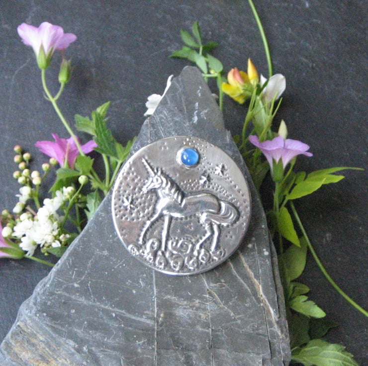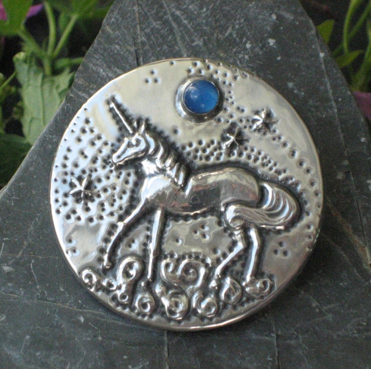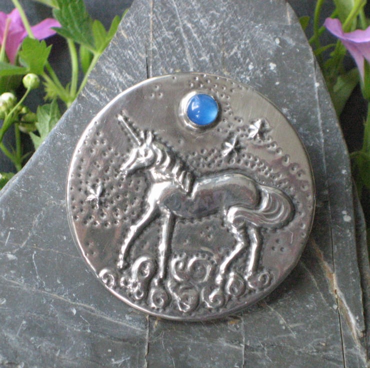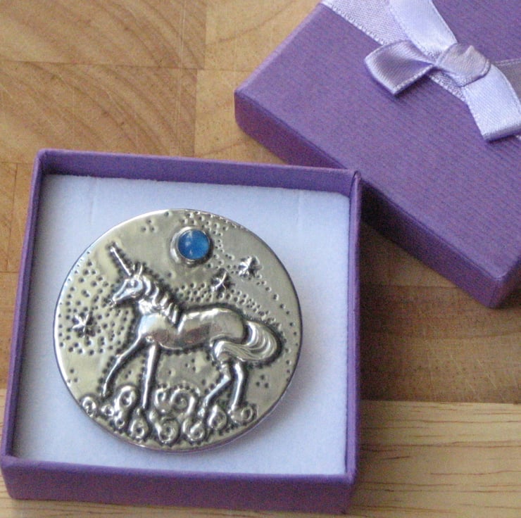 Unicorn silver pewter brooch with blue agate moon. I have crafted this striking brooch entirely by hand using the repousse method of embossing shiny lead-free pewter. The pewter has been mounted on an aluminium base, so the brooch is light in weight for versatility of wear on a variety of fabrics. 45mm in diameter. Set with a beautiful blue agate stone and presented in a pretty gift box, it would be a perfect present for a woman who loves myths, legends and fantasy.