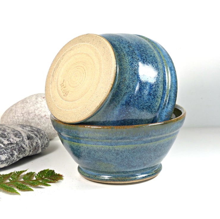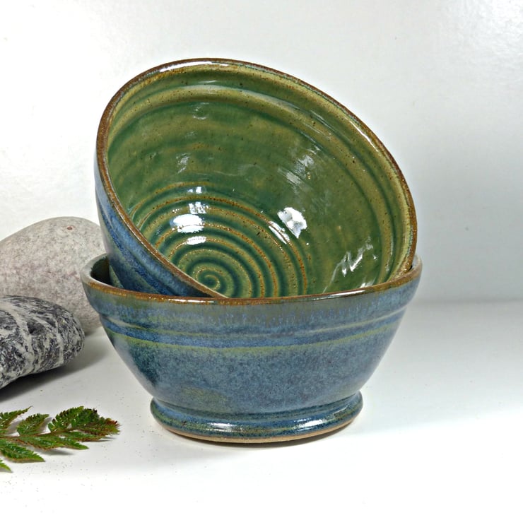I threw these bowls on the potters wheel using a strong stoneware clay. I then added the detailed spiral that sits inside the bowl and turned the base to make a foot ring. They were then fired to a bisque before being glazed in three contrasting and complimentary glazes and refired to 1220C.