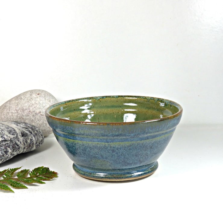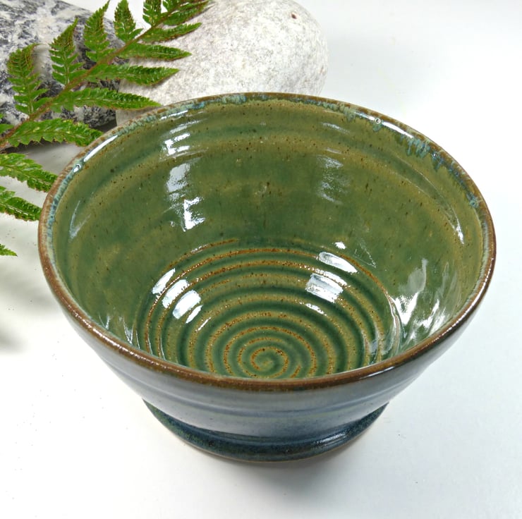 The colours in this bowl include on the inside a rich mixture of greens, jade and browns, the rim an olive green, and the outide rich blues and greens.