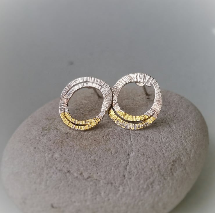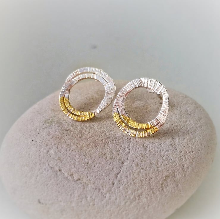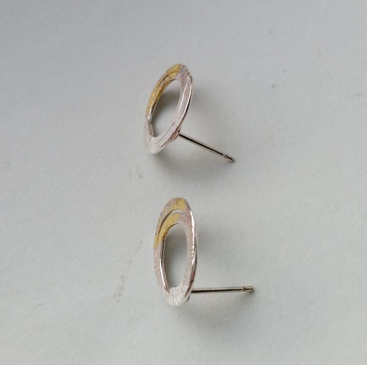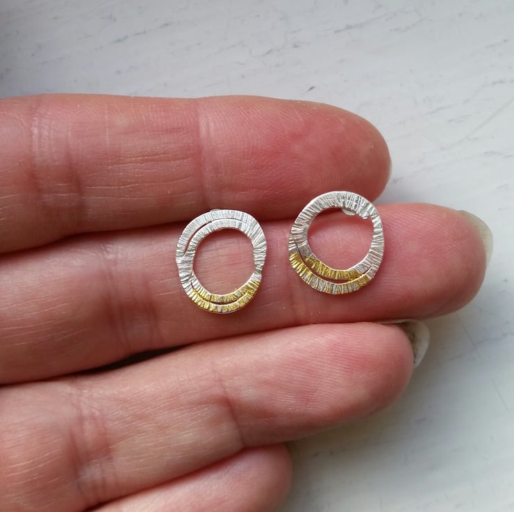 These minimal studs are flattened loops of textured silver with a lovely little 24ct gold accent. They have a semi matt finish and are lightweight and easy to wear. Posts and butterflies are all sterling silver. Each pair is individually made and no two are the same...