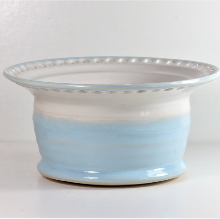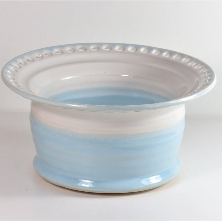 I then glazed it using a aqua blue and white combination. The bowl was then refired to 1240 centigrade.