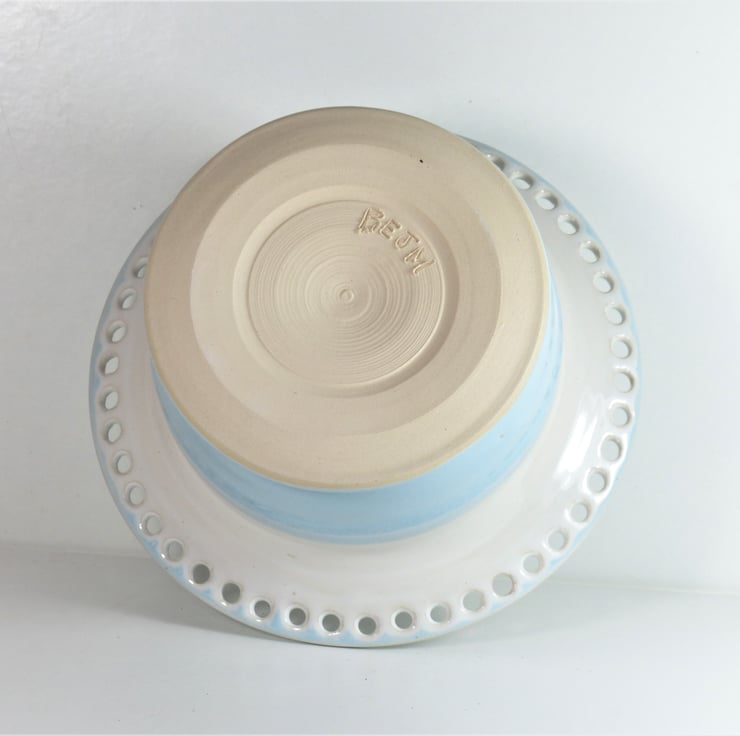I threw the bowl on the wheel using a strong stoneware clay. By using stoneware the bowl will be very durable. When the clay has harded I cut the holes into the clay before firing the bowl to bisque, 1000 centigrade