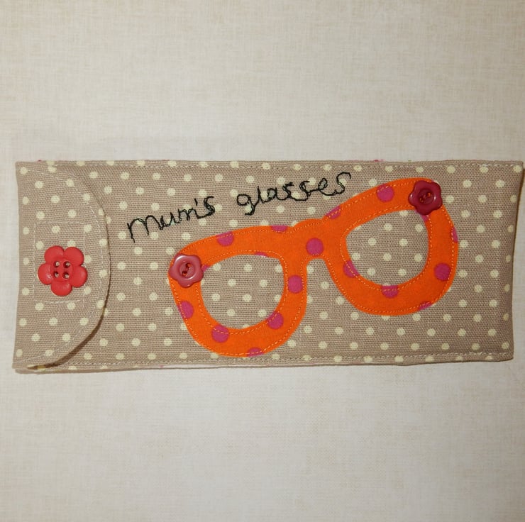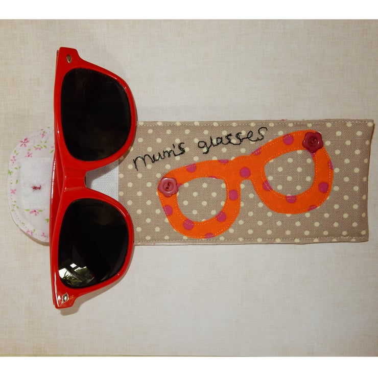 This is a handy case for your glasses or sunglasses, it is made from a beautiful spot print cotton fabric with a floral lining. It also has a layer of wadding for protection. There is a fun pair of glasses appliqued on and the words "Mum's glasses" has been machine stitched. The case fastens with Velcro and has decorative buttons.