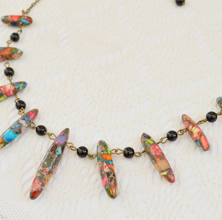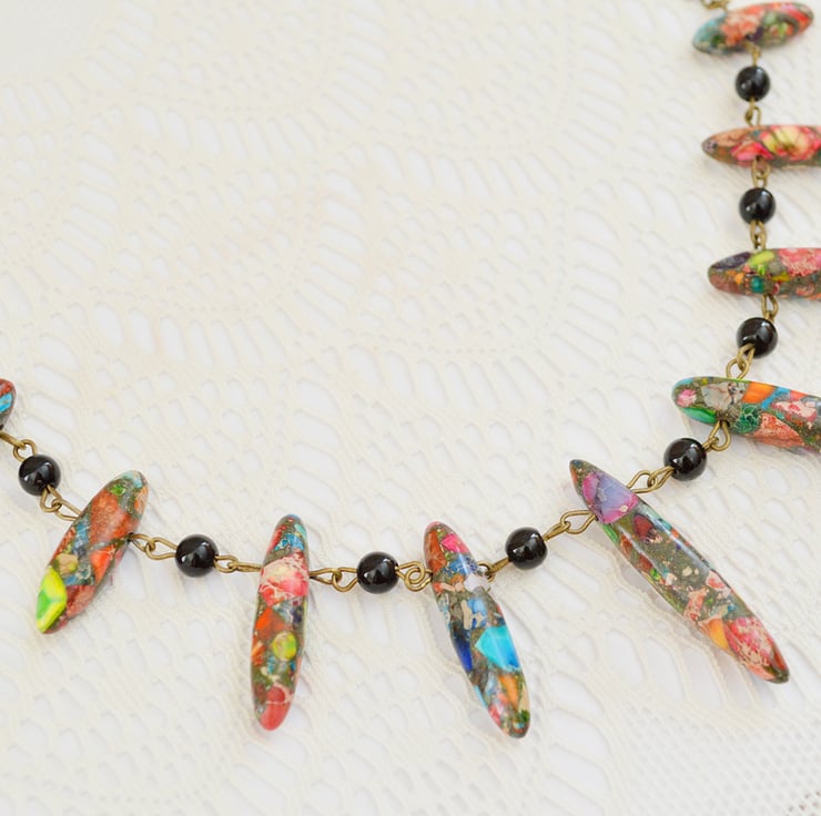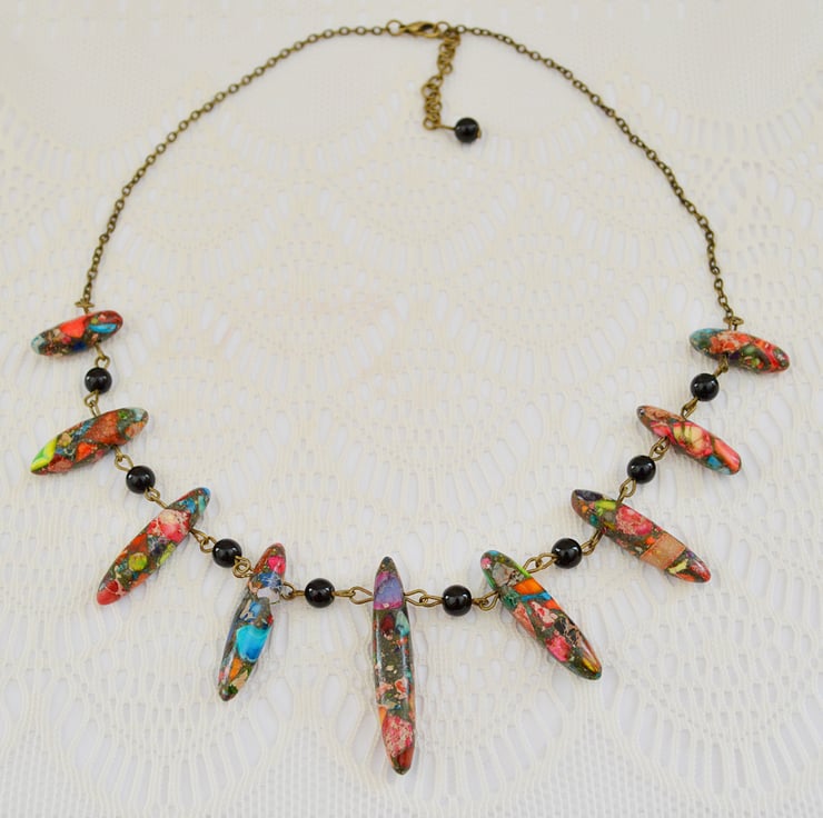 A statement, bib necklace featuring a fan of rainbow coloured, Sea Sediment Jasper, spike beads, black spacer beads and antique bronze findings.