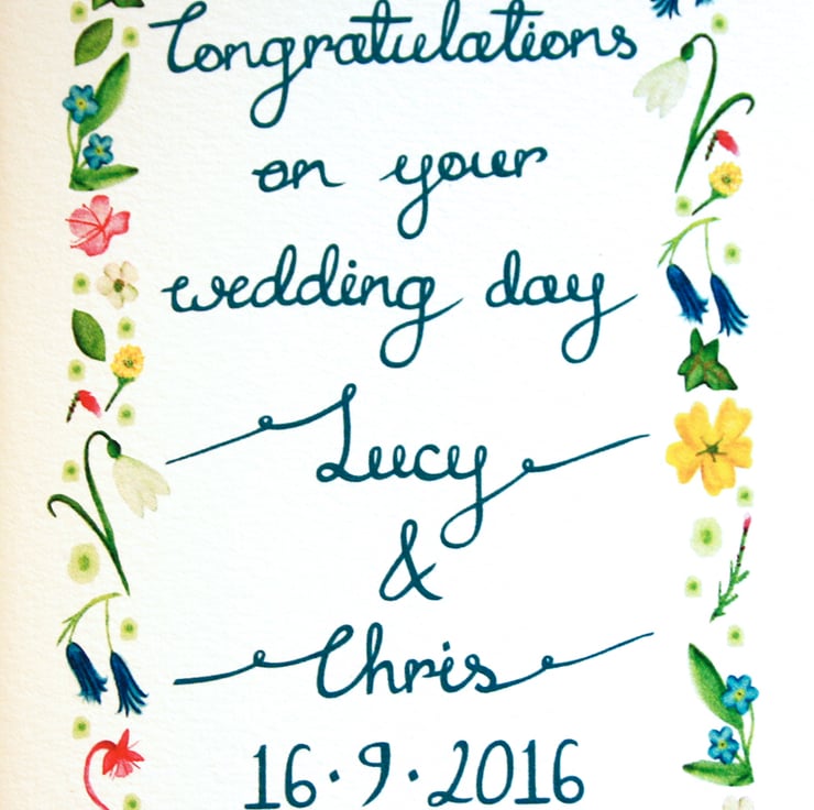 Pretty personalised wedding card featuring my watercolour, wildflower border with calligraphy 'Congratulations on your wedding day' and personalised with your choice of names and date.