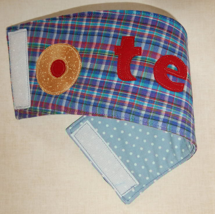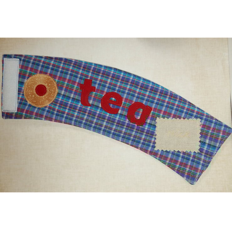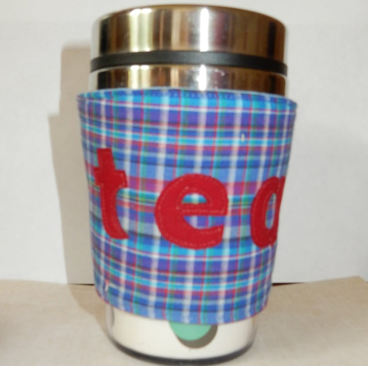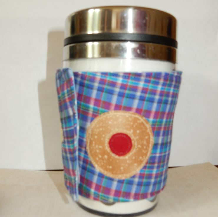 This is a blue tartan travel mug cosy designed to fit travel mugs similar to the one in the photo (mug not included), with the word "Tea" appliqued on and some delicious looking biscuits. It is approximately 3.25 inches deep and fastens with Velcro. It is reversible with a spot fabric on the other side, and a layer of cosy wadding.