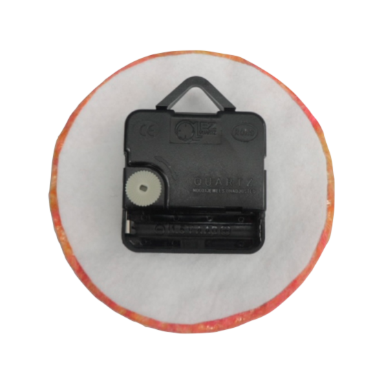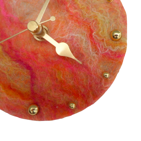 A piece of nuno felt in orange and pink shades has been used to cover the face of this clock. A fine layer of merino wool fibres blended with tussah silk has been nuno felted onto a piece of silk chiffon. The nuno felting process causes the fibres to migrate through the silk and bind with it resulting in a beautiful sheer fabric.