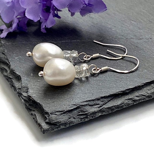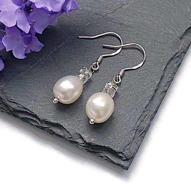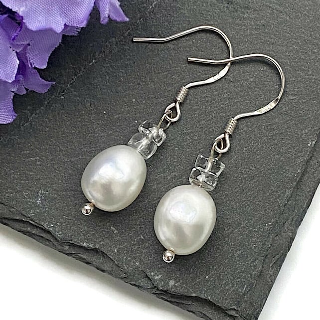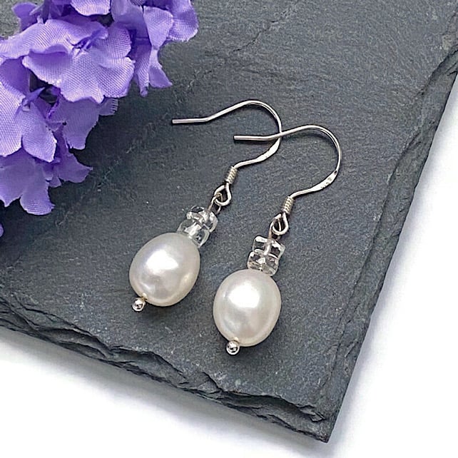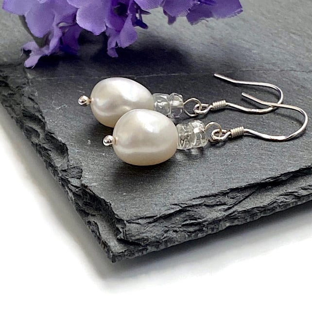 Featuring 10x8mm white Freshwater Pearls, I have added two 5x2mm faceted White Topaz rondelles to each earring to give that little hint of sparkle.