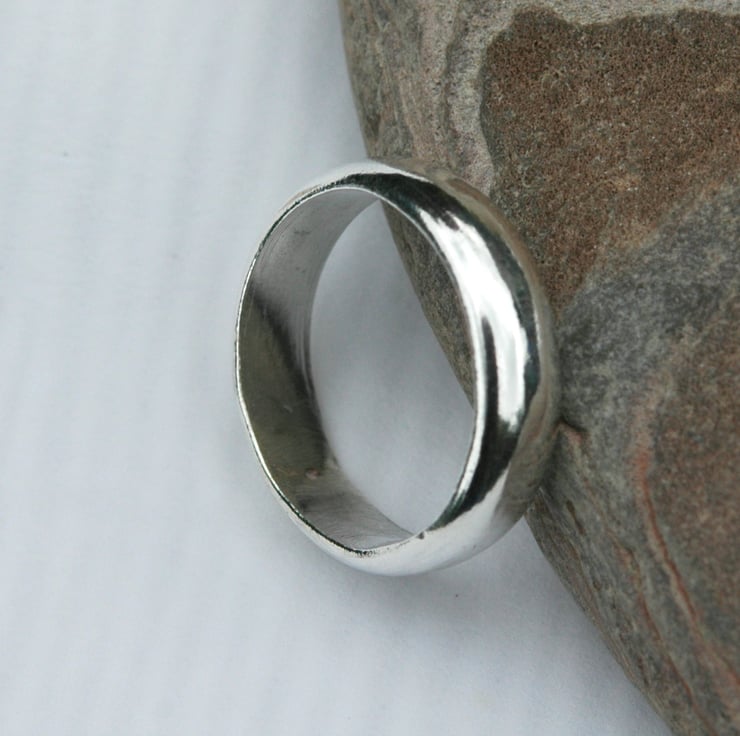 This chunky sterling silver ring is a classic design with a D-shaped profile, 6mm wide and 2mm thick. It would make a lovely gift for a man or a woman. The ring has been tumble-polished to a high shine. It is currently available in size R but contact me if you would like me to make a different size.