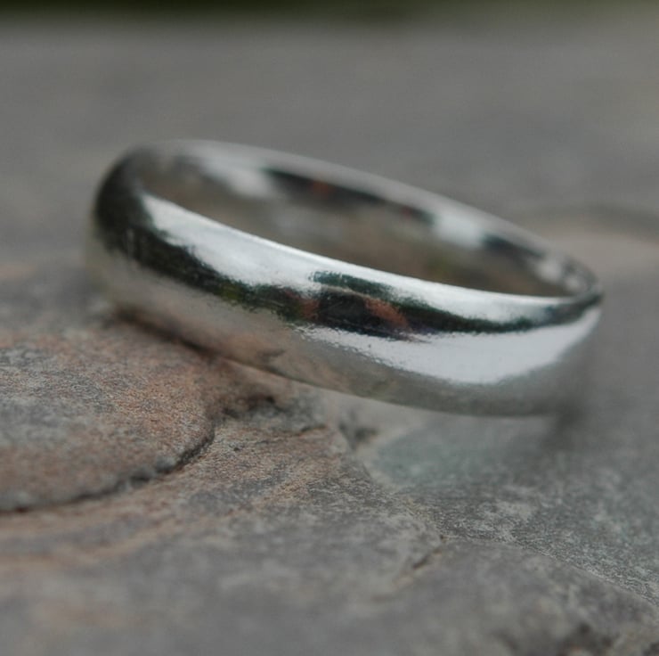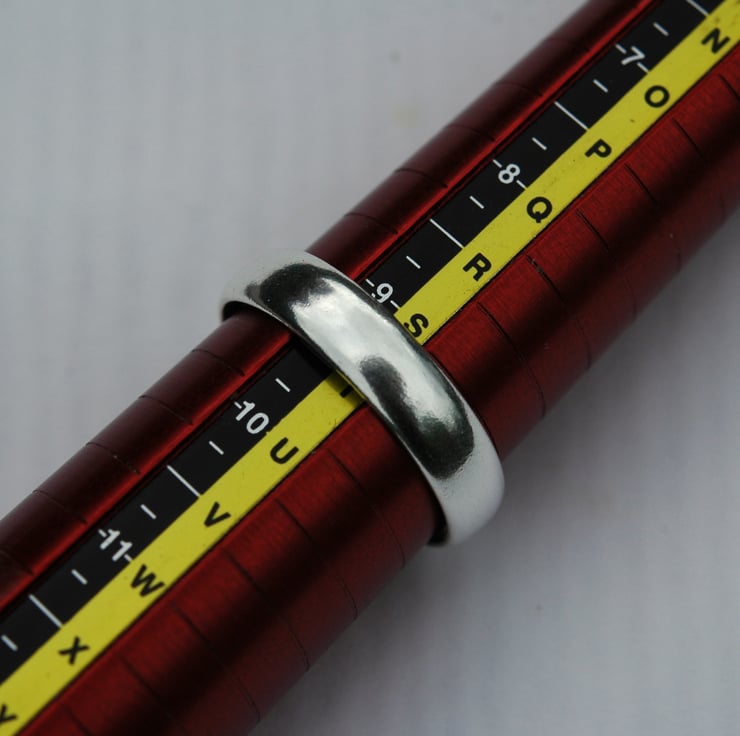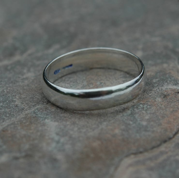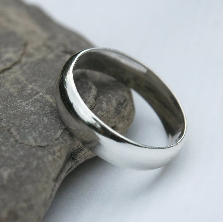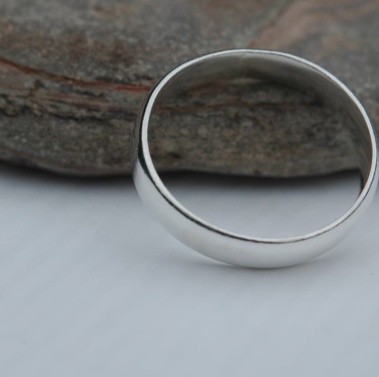This wide band sterling silver ring displays classic simplicity of design, with a D-shaped profile 5.1mm wide and 1.6mm deep. It is currently available in size T so could make a lovely gift for a man or a woman. Contact me if you would like me to make a different size. This ring has been hallmarked on the inside by the London Assay Office and tumble-polished to a high shine. A matt finish can be applied if you prefer.